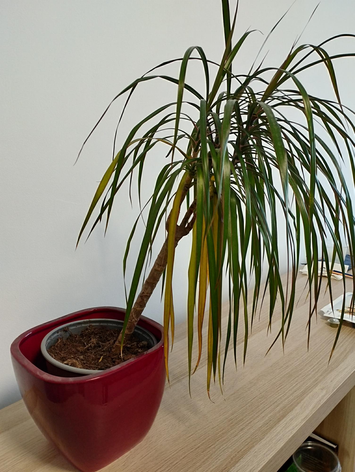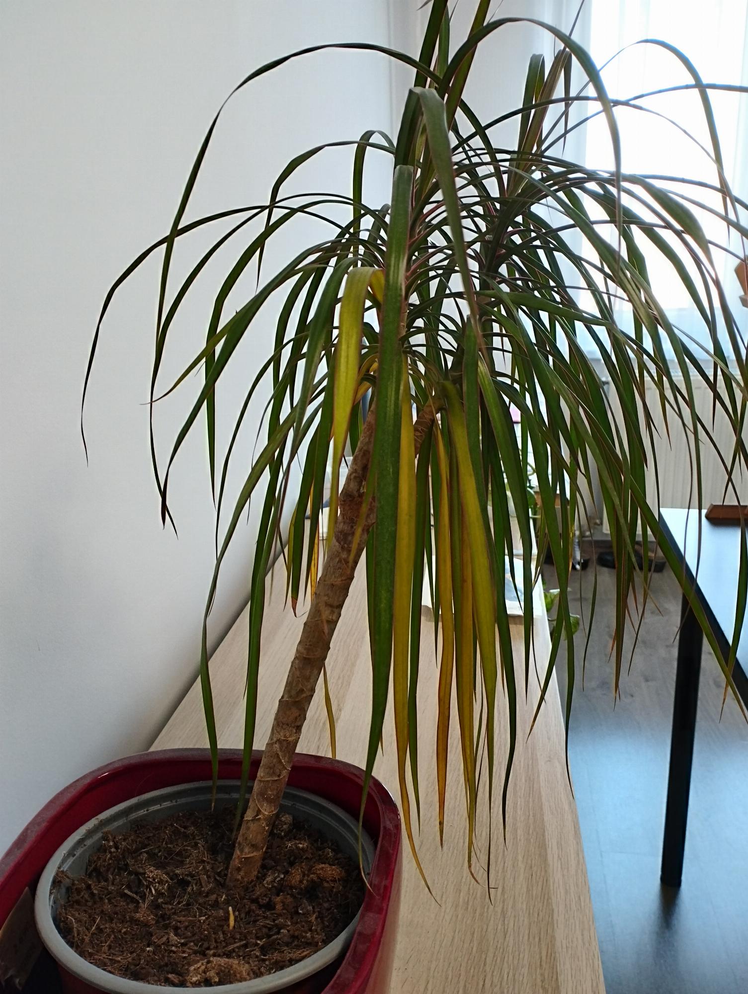 A sárkányfánk levelei az utóbbi időben sárgulni kezdtek. Olvastam, hogy ezt okozhatja túllocsolás, így igyekeztünk ritkábban (1,5-2 hetente) és kevesebbet locsolni, de így is sárgulnak a levelei. Locsoljuk még kevesebbet? De közben a földje száraz, a levelei egy idő után megereszkednek. A helyét nem változtattuk, és átültetve sem volt még. Mit tehetünk? Válaszát előre is köszönjük szépen!