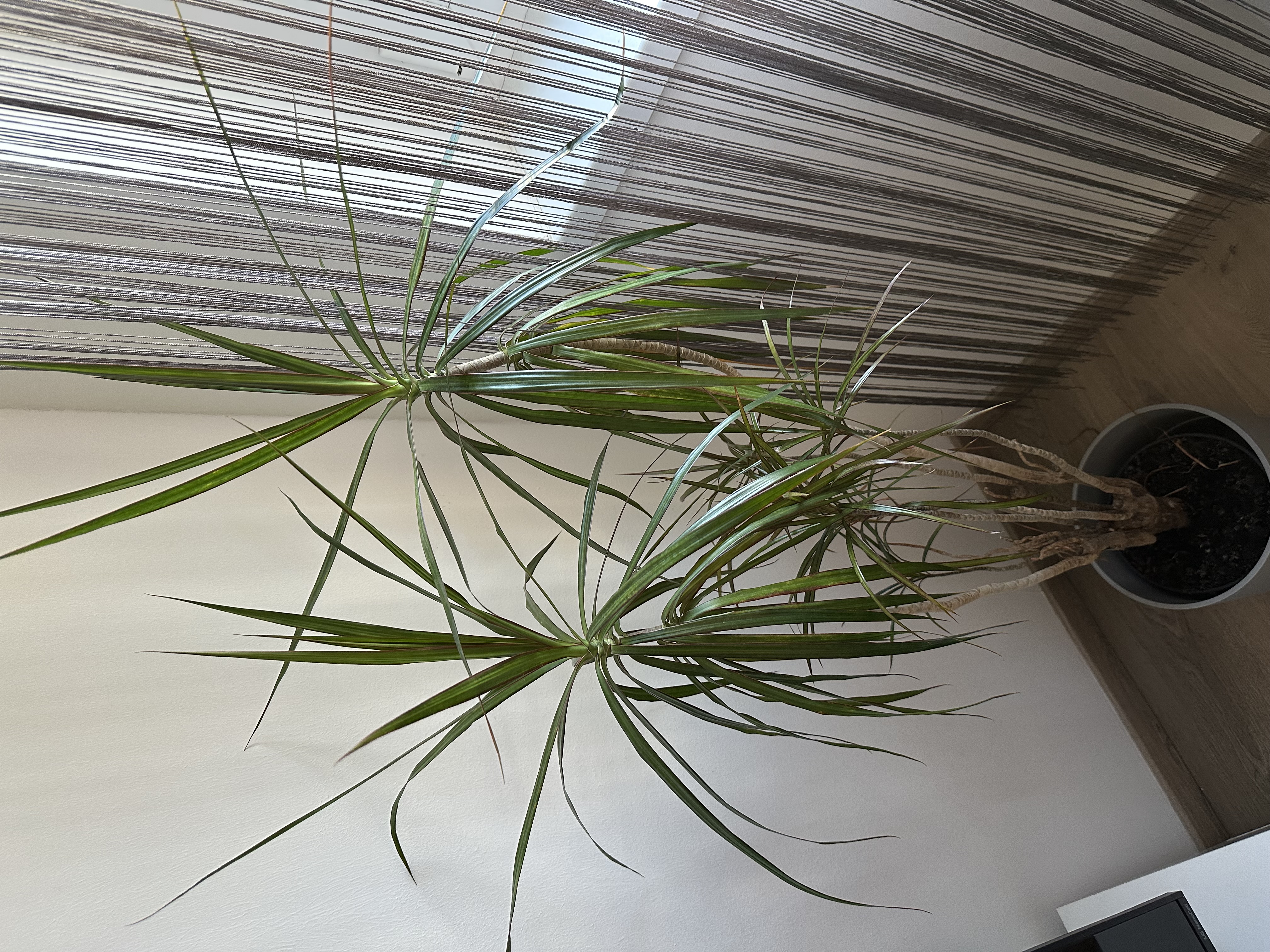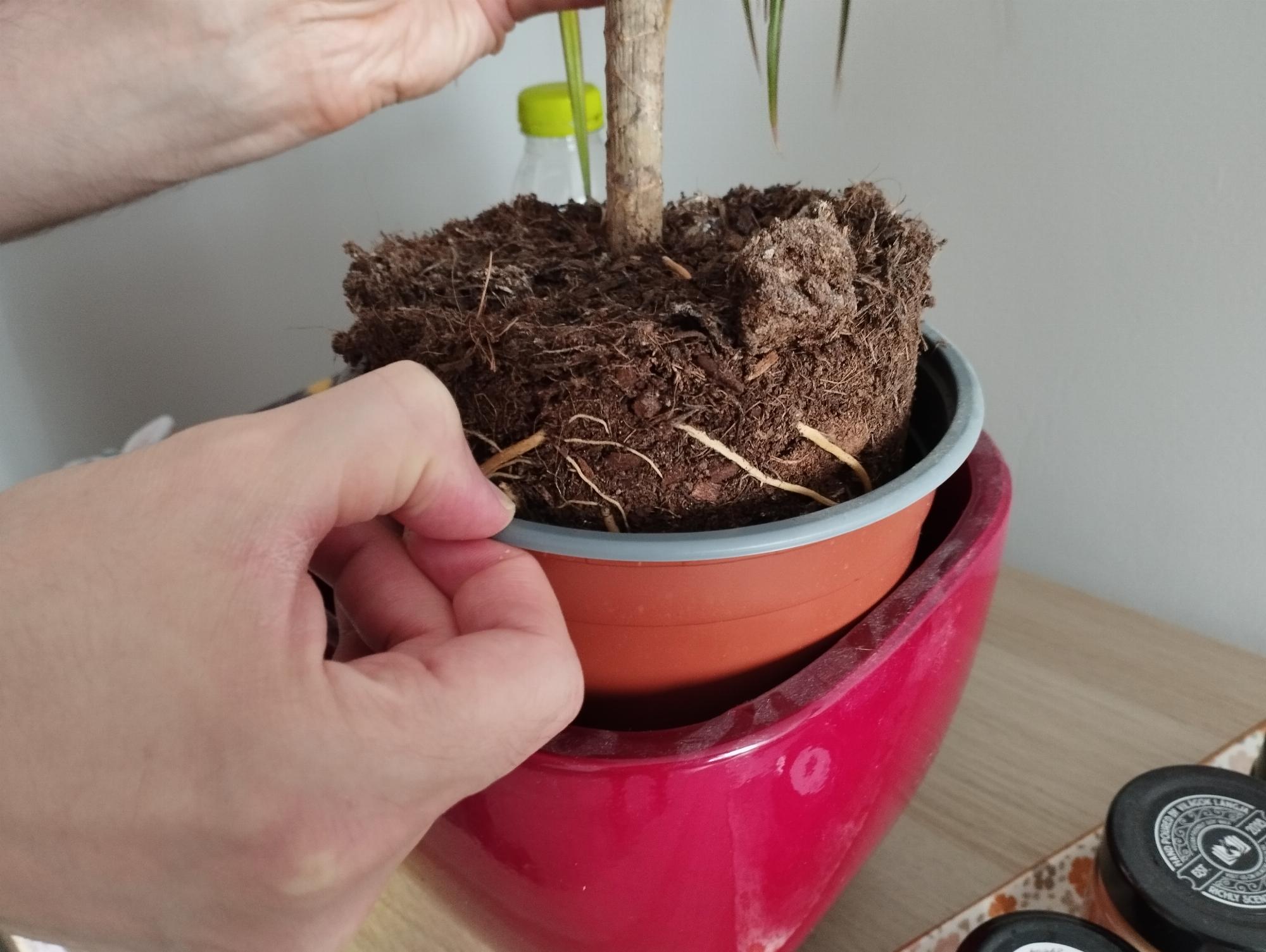 Kb. 2 éve vásároltuk a növényt az Aldiban, és már akkor is ferde volt, de a sárgulást eddig nem tapasztaltuk. Tápanyagot szokott kapni, de az utóbbi pár hétben elmaradt. A gyökerei alul már kibújtak a cserépből, és amennyire a sima kiemléskor láttuk, inkább szárazabbak.