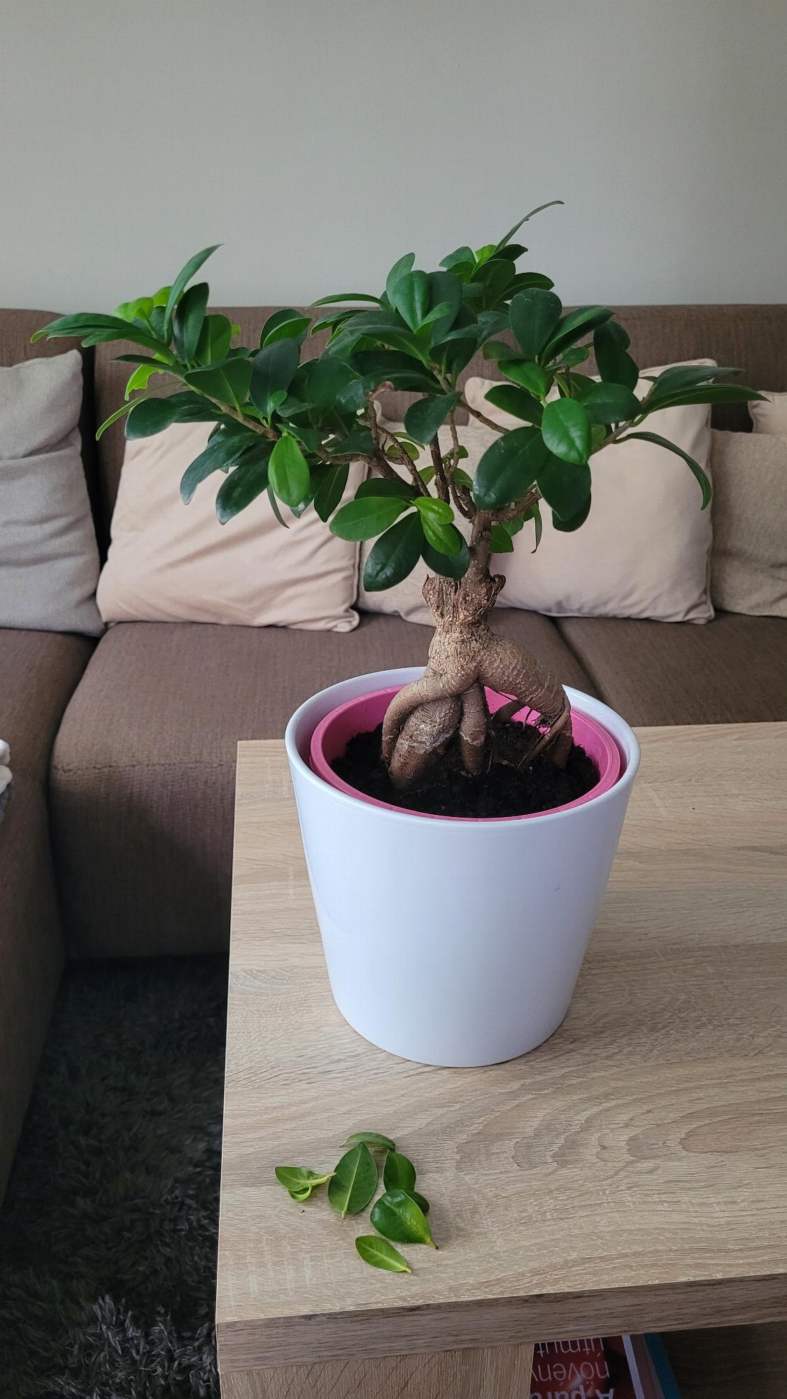 A képen a lassan 1 éves fikus ginsengem látható, körülbelől két hete kezdett romlani az álapota. Hetente egyszer öntözöm. A levelek lehajoltak, és érintés után lehullanak.