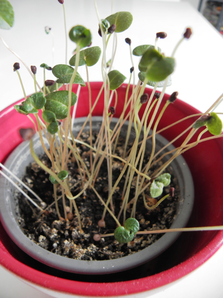 A magokat elvetettem ( a neten utánanéztem, hogyan kell) Szépen ki is kelt elég sok. Sajnos a kezdeti időszakban a hűvös pincében volt, bár volt természetes fény, de nem közvetlenül ablakban volt a cserép. ezért a kis magoncok eléggé megnyúltak. Már jó ideje csak egy kis levélke himbálódzik a hosszú száron, további fejlődést nem látok, pedig most már ablakban van.