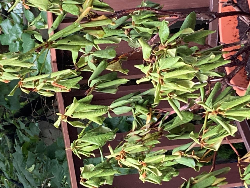 Cserépben nevelt rhododendron - pár éve nem virágzik, de szépen nő és folyamatosan hoz új hajtásokat, tele van rüggyel, múlt héten rövid idő alatt ilyen lett. Voltak elsárgult levelei is, azokat eltávolítottam. Esetleg hőgutát kapott? Megmenthető? Mit kellene tennem?