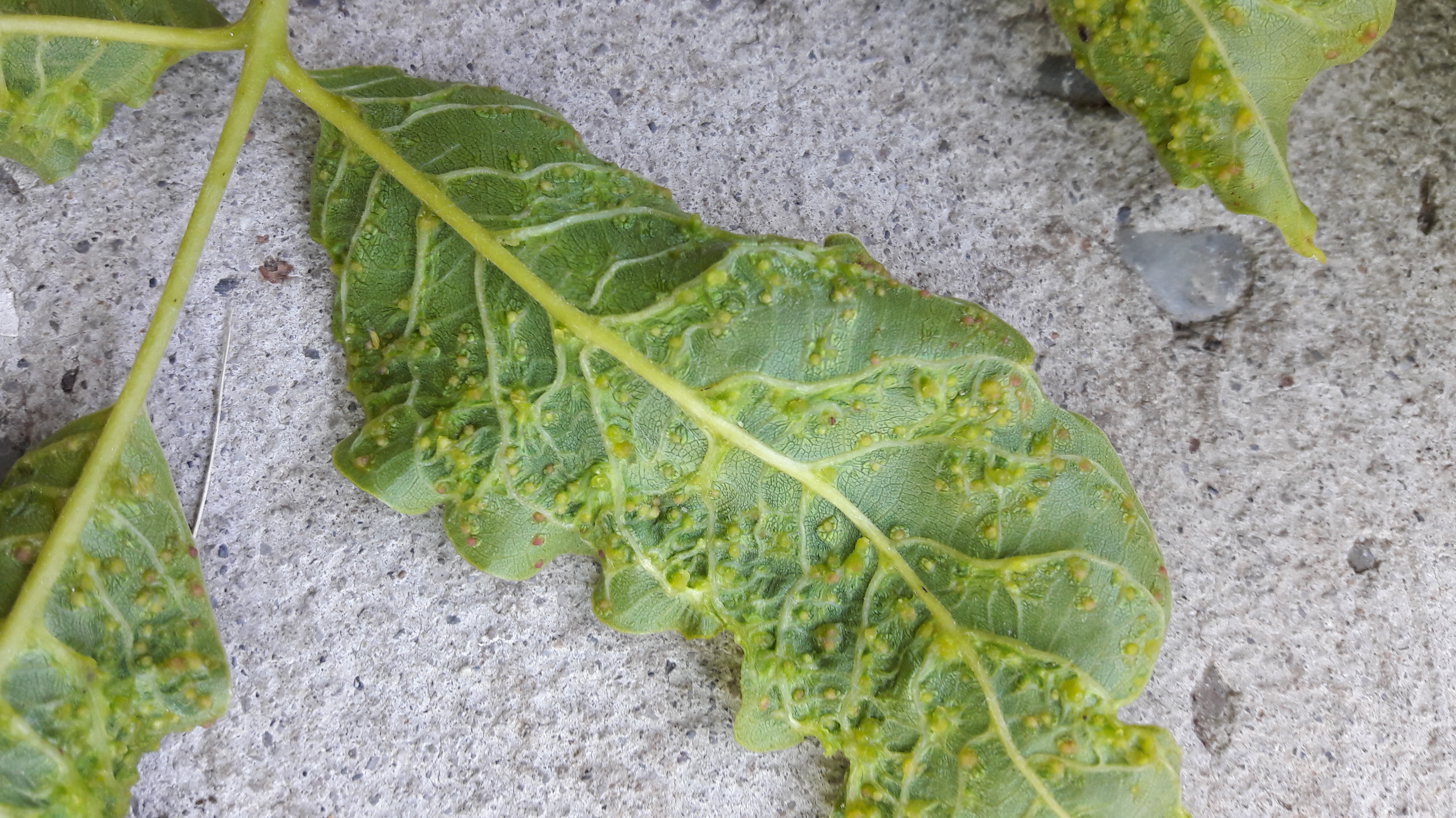Ezek a dió szemölcsös gubacsatkája által okozott tünetek. Látványosak, de a kártevő általában nem jelent veszélyt a növényre, így védekezni nem szoktak ellene. (Egyébként az év ezen időszakában már nem is lenne mód erre.)