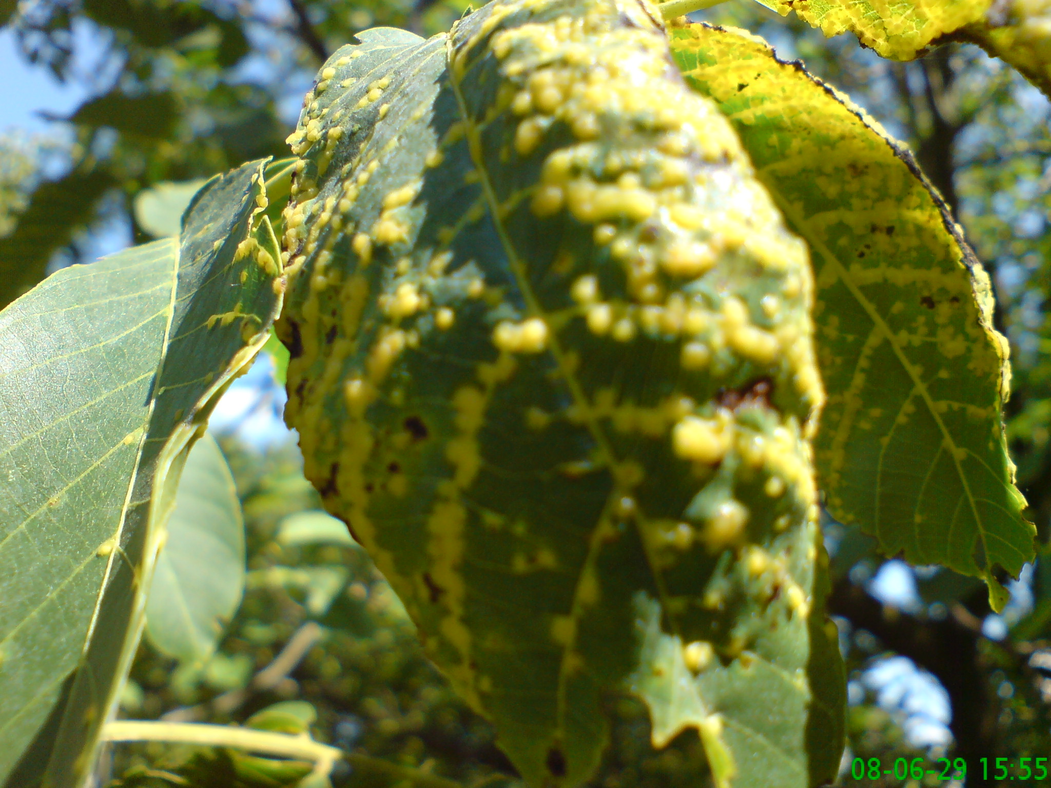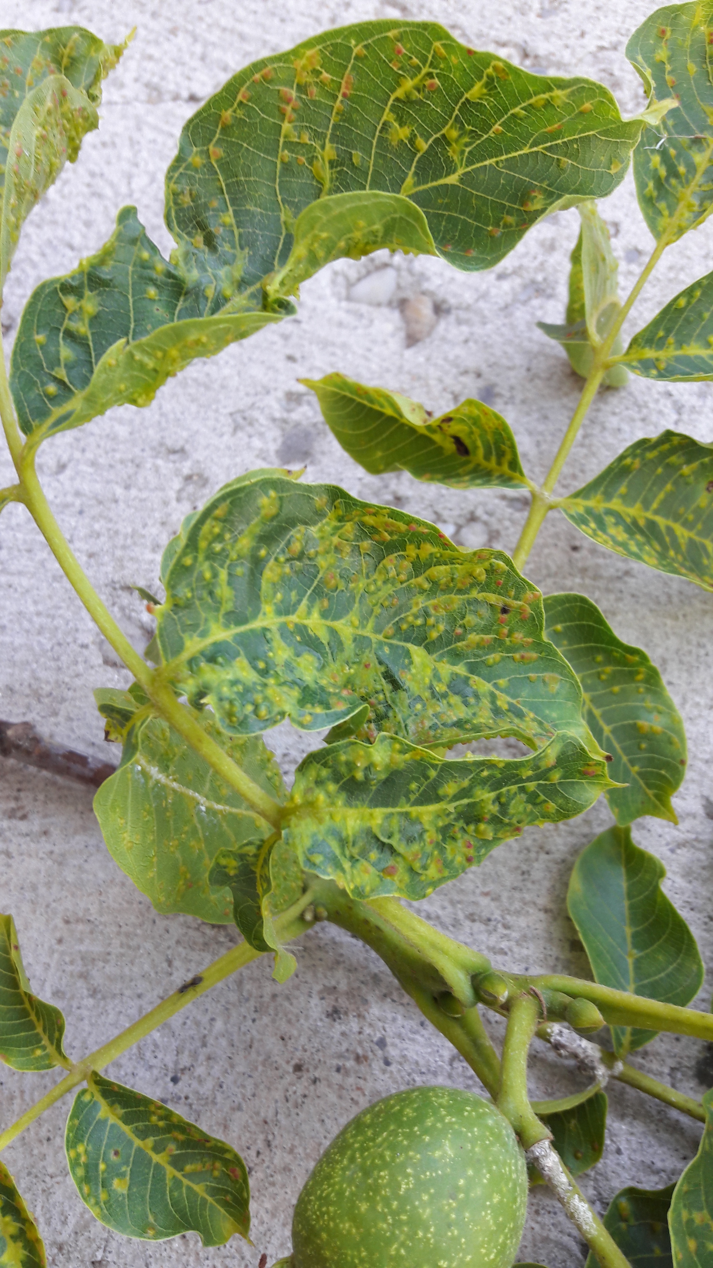 A csatolt képeken a dió szemölcsös gubacsatka kártétele látható. Első ránézésre látványos és ijesztő tünetek okoz, de ennek ellenére általában kis jelentőségű kártevő. Kémiai védekezésre nincs szükség. Ez a kártevő nem okoz dióhullást.