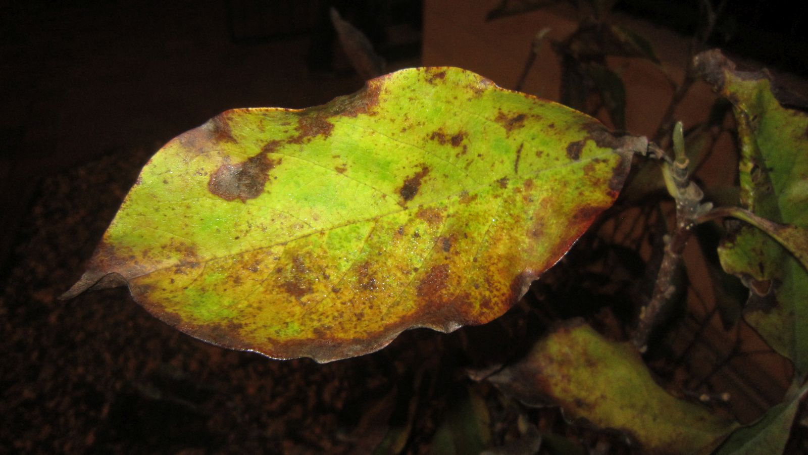 Ezen a képen pedig a magnólia levele látható. Némely levelek végei az elbarnult részeken fodrosodnak.