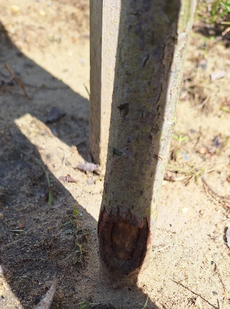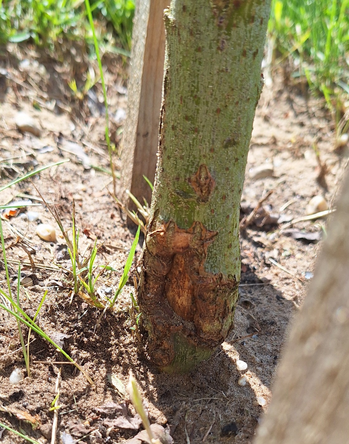 A törzs repedése erős hideg /fagy/ hatására is bekövetkezhetett. Esetleg a növény fagyzugban van vagy fagyérzékeny. Lehet, hogy ültetéskor sok tápanyagot - szerves és műtrágya - dolgoztak a talajba, és tél elejére sem érett be a vessző. Ezt mutatja a rózsaszínes rész, ahonnan kihajtanak ágak.