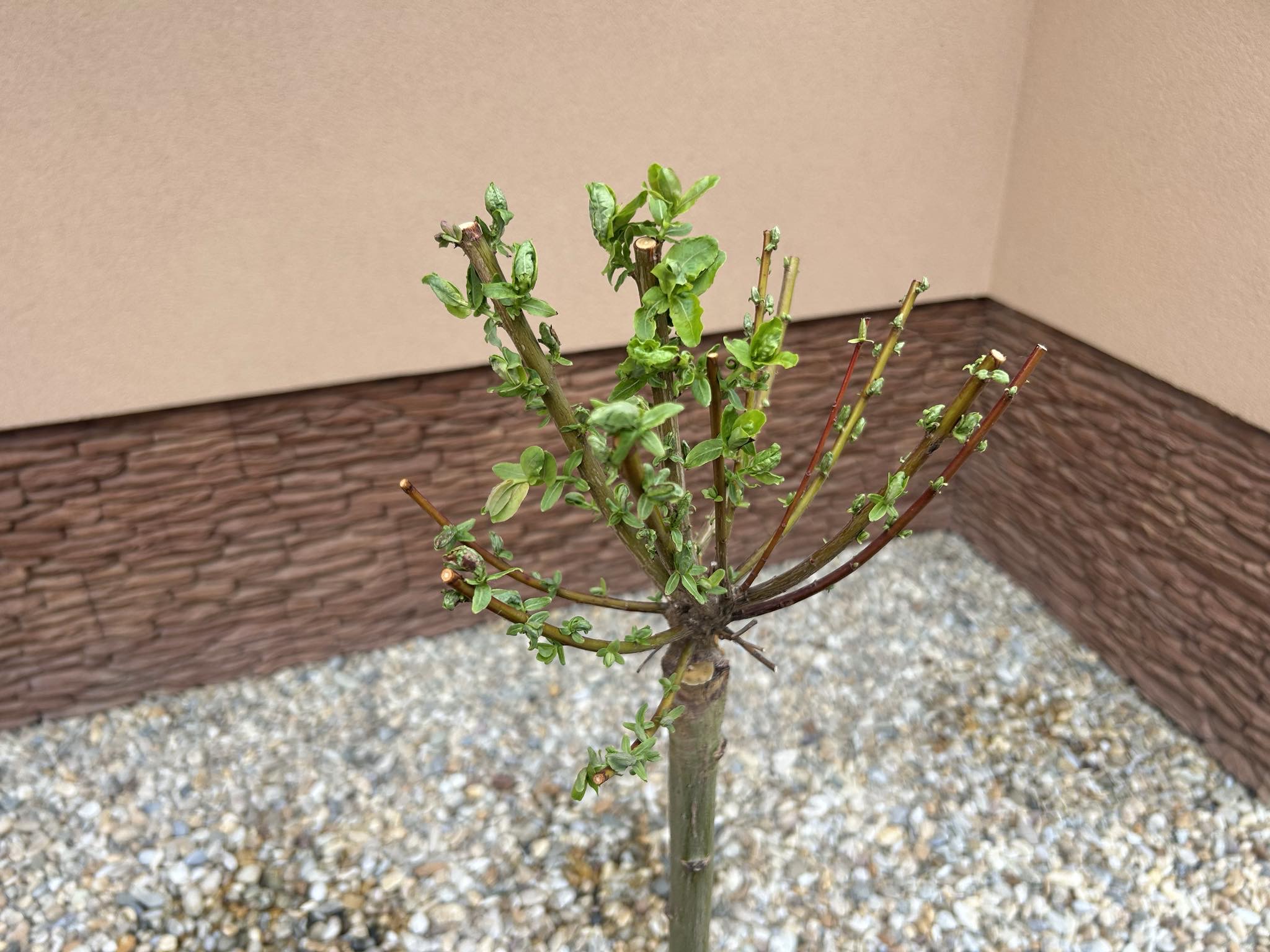A felvétel a legnagyobb problémát az oltás ill. szemzés helyén mutatja. Ott lehetséges egy-egy ág pusztulása, elszáradása. Nem kóros eredetű, inkább technikai hiba. A hajtásba nem indult ágat azonban most még ne vágja vissza egészen, csak a tőtől számított egy-két rügyig. A metszés indukálja a rügyet - ha akár csak kis "élet" van benne.