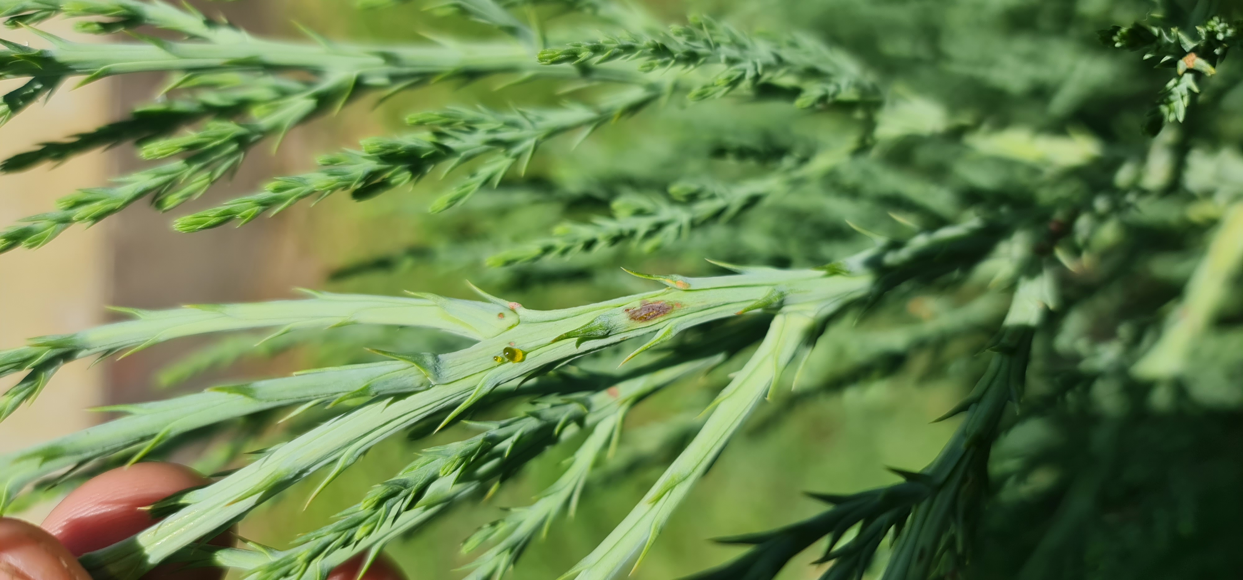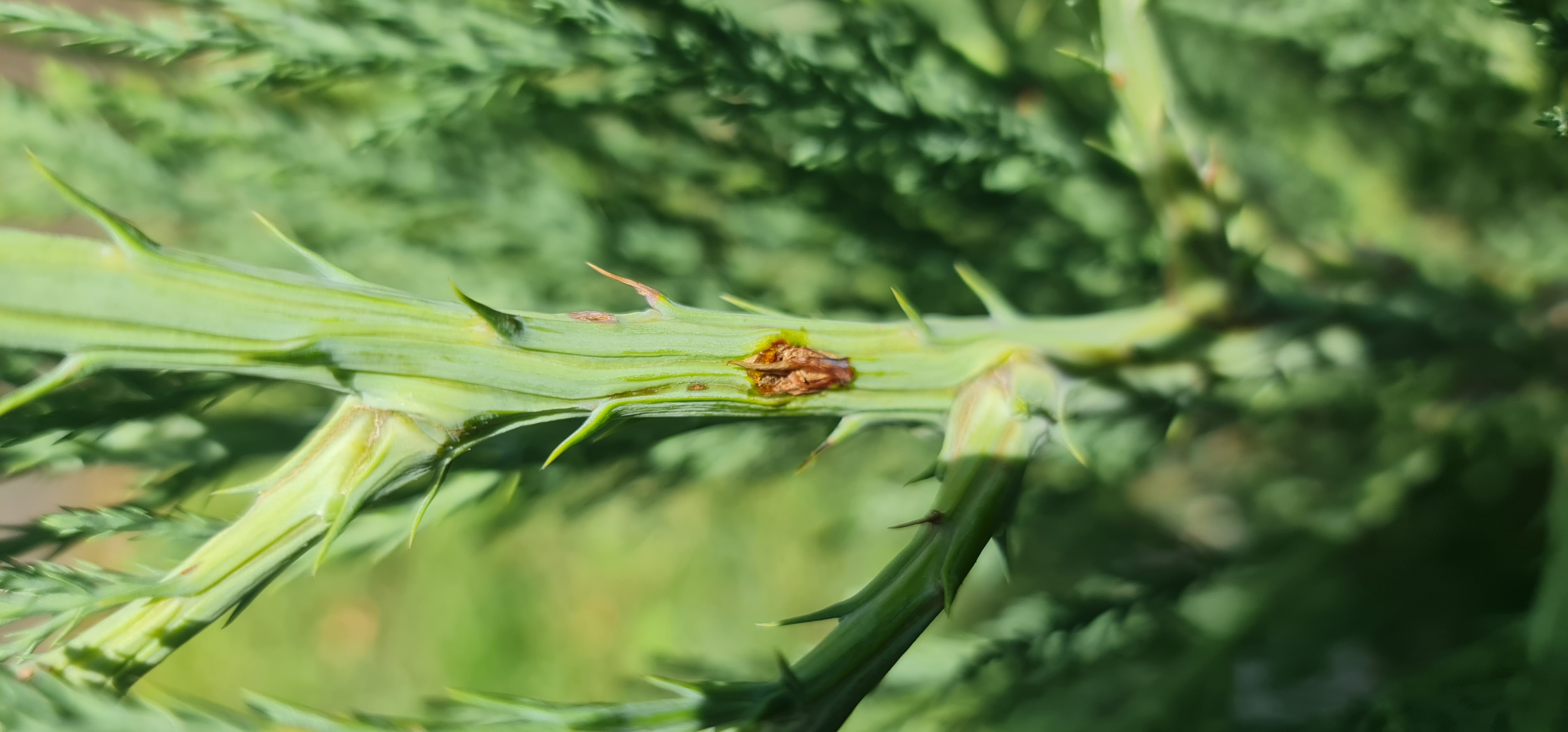 Valami szurkálja a hajtásokat, talán poloska. Ellene Mospilan javasolt. Viszont a sebeken keresztül támadhat a Serridium, ami nagyobb gond. Ellene Armetil C javasolt.