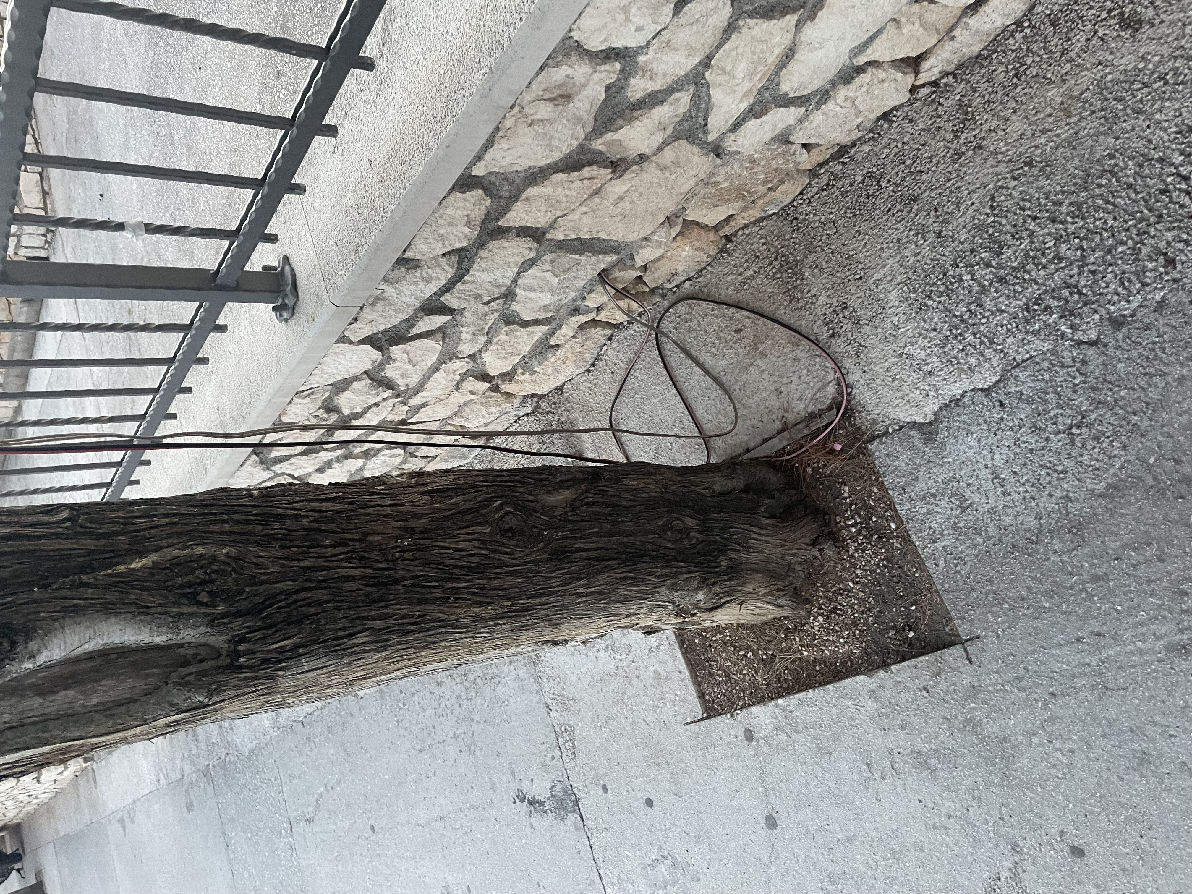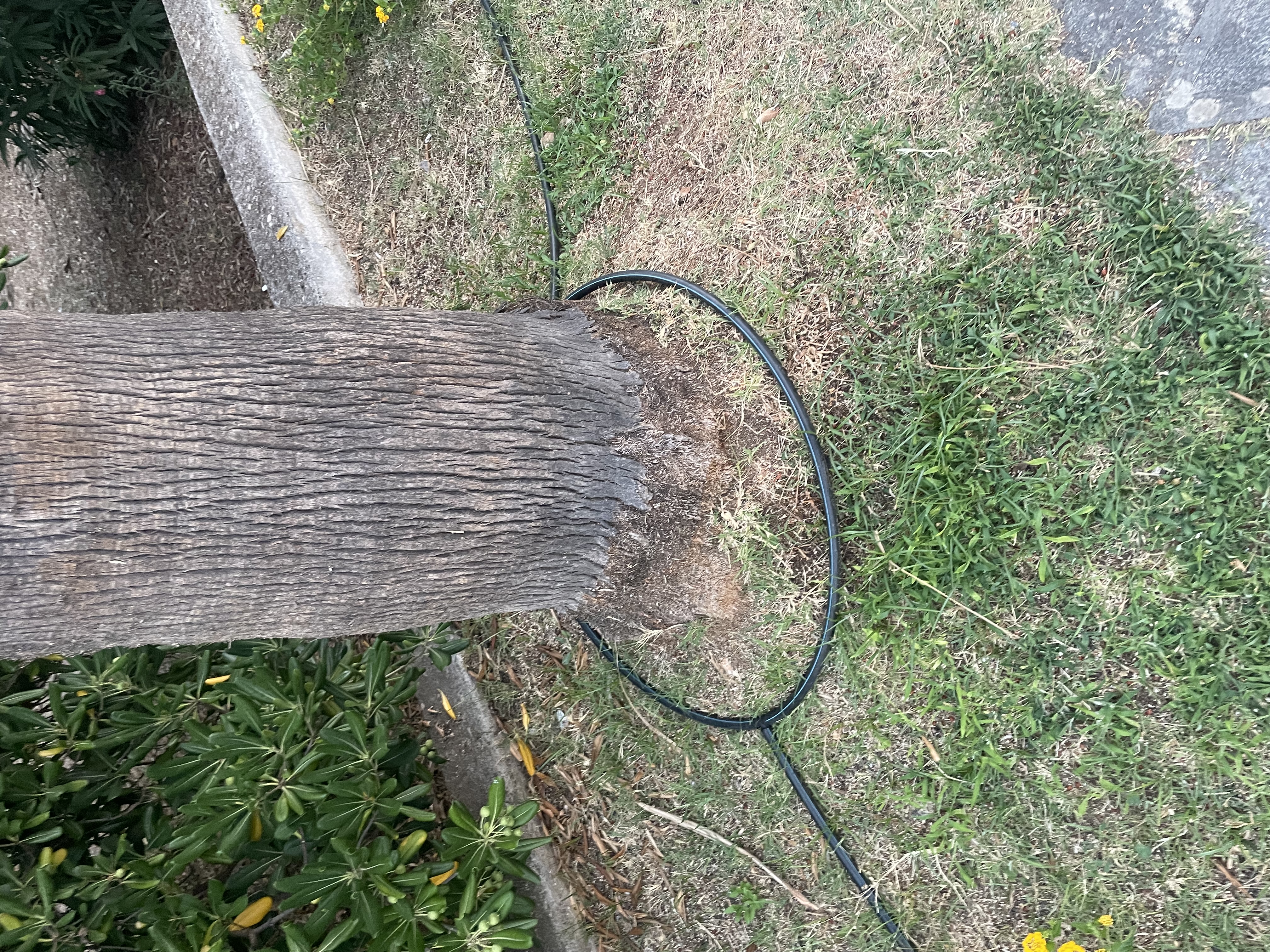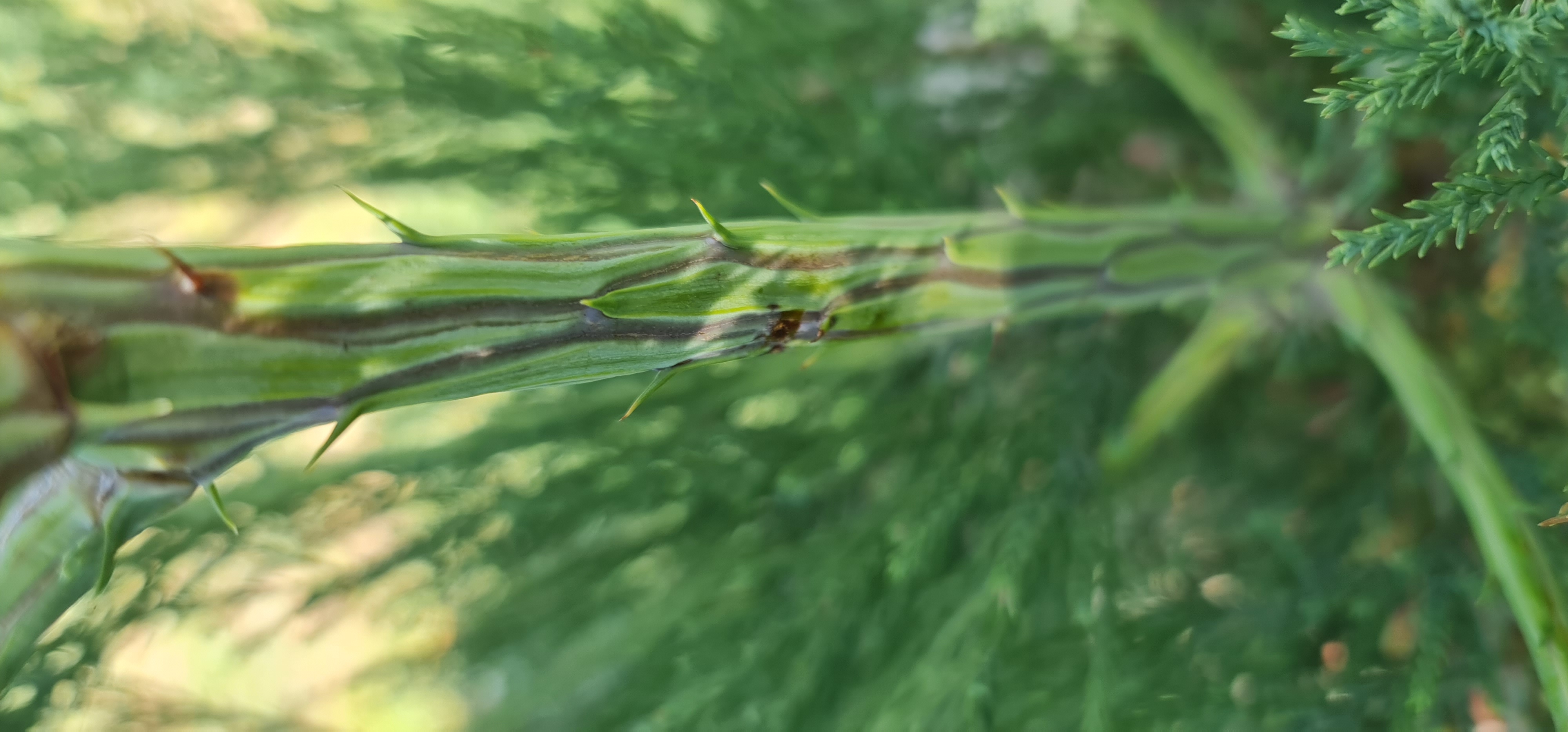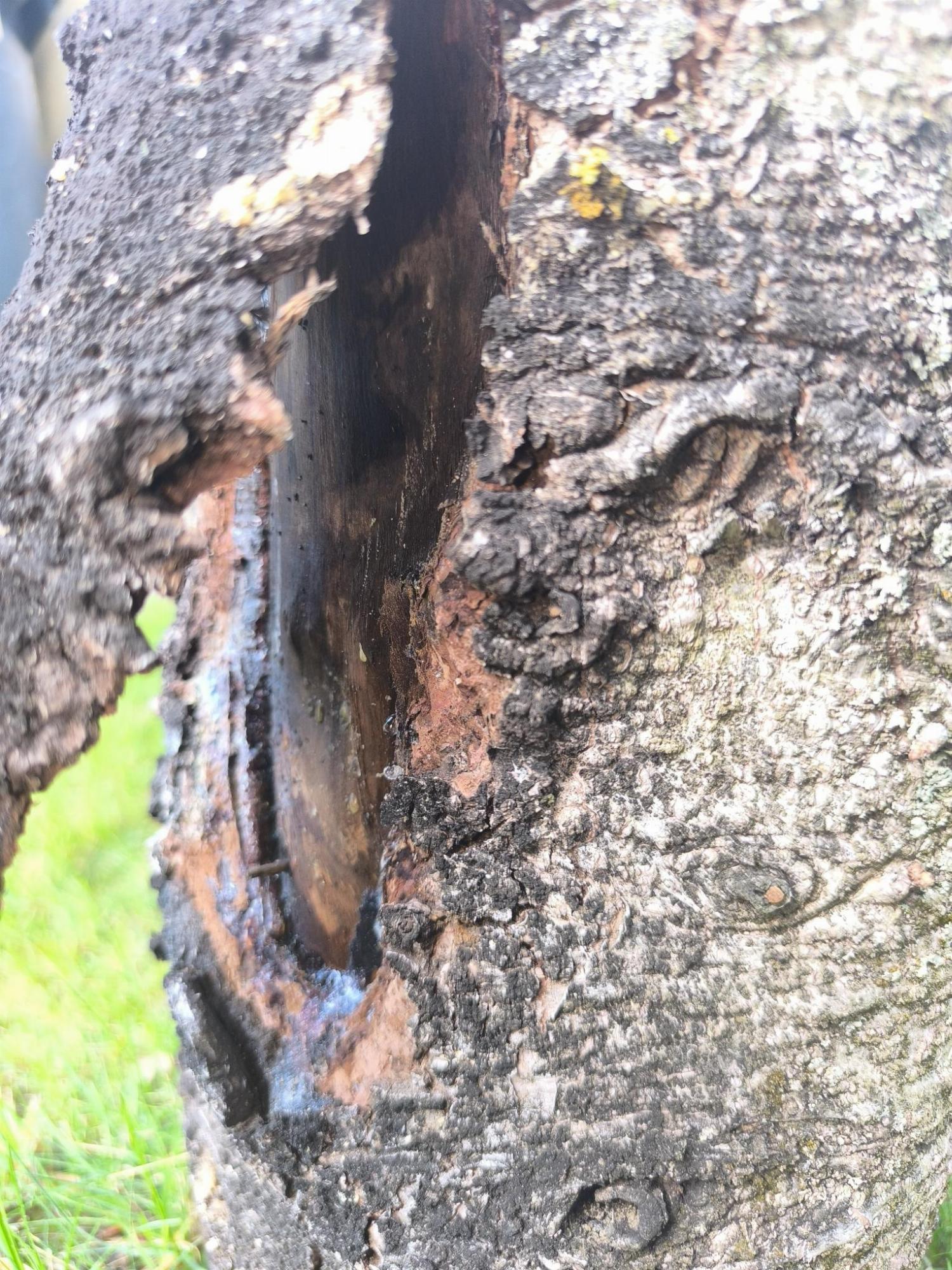 A törzse kb 1 m hosszon feketés színű lett (mintha megégett volna) és a kérge pedig elkezdett leválni és alatta pedig üreges lett a törzs. A fa tüskéi is elkezdtek száradni egy jelentős részen. Csatolok egy fotót is a törzsről.