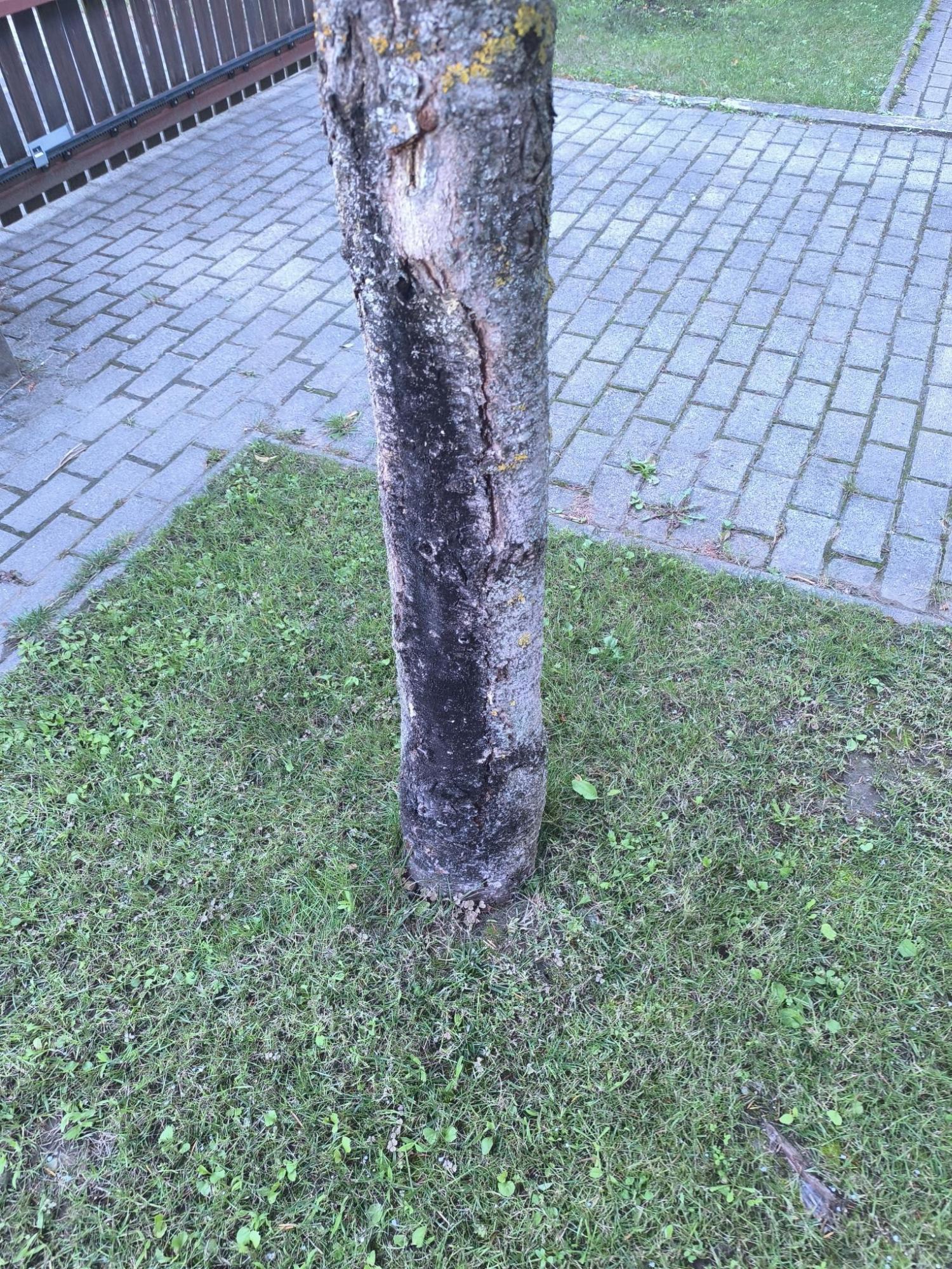 A fa déli oldal kicsit szebb, ott több napot kap, különösen és szinte kizárólag, amióta a szomszéd telket beépítették. A fa teljes hosszán látom az elszineződéseket.