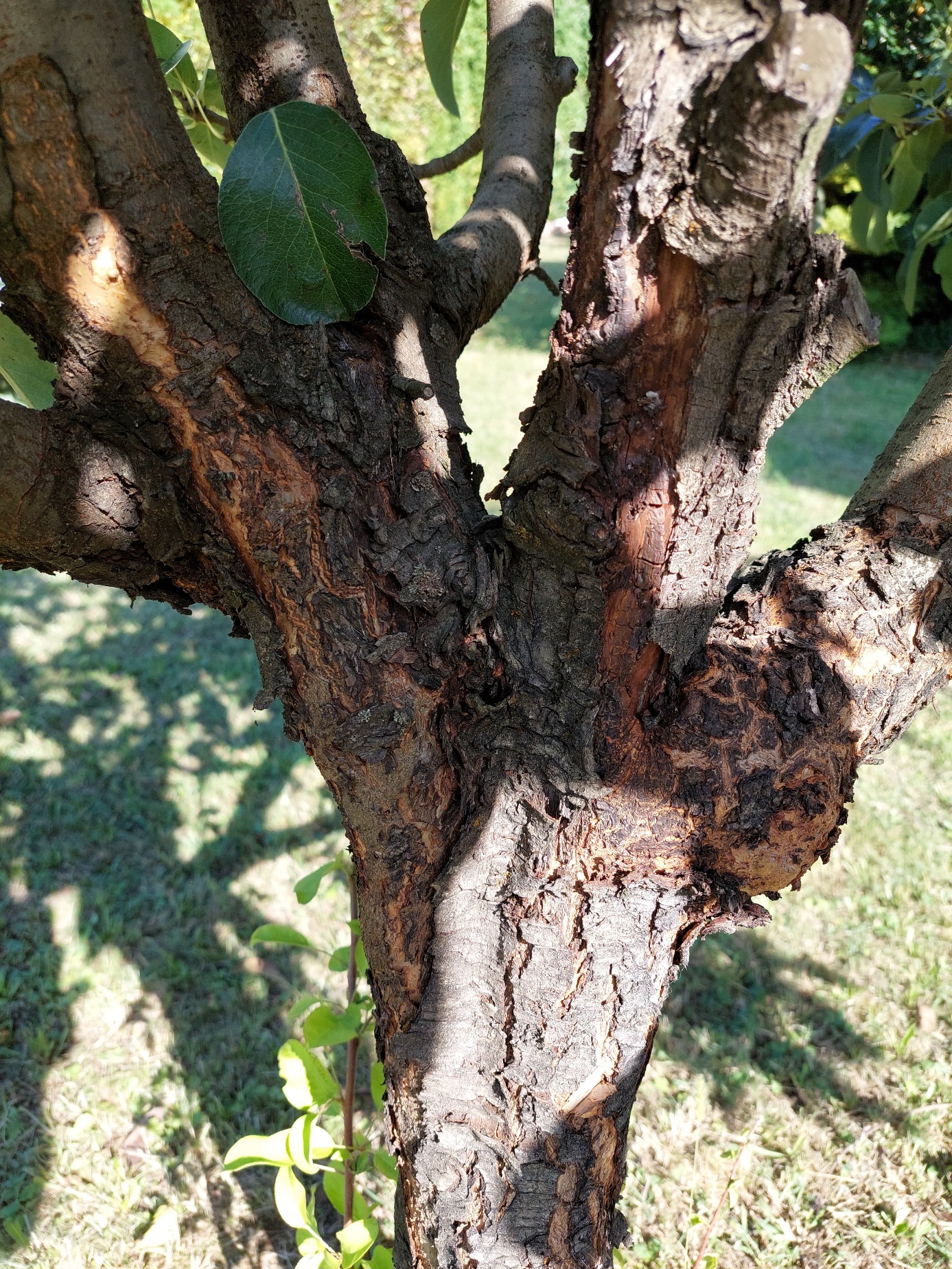 A körtefa törzsét súlyos betegség támadta, amely a tünetek alapján feltételezhetően gomba eredetű. Jó hír azonban, hogy a fa spontán gyógyulása megkezdődött a kalluszképzés, mely a kép bal oldalán látható. Azonban a folyamat lassú, segítségre szorul a körtefa.