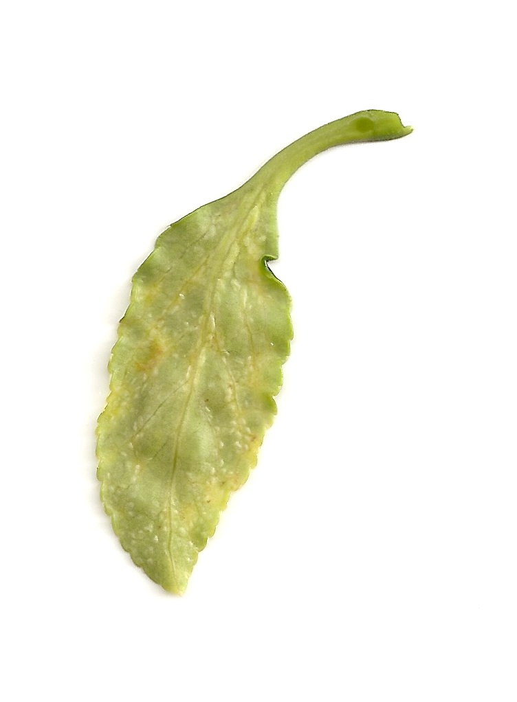 Sajnos nem igazán tudom visszaigazolni a feltevését. A levél fonákján lévő kis fehér foltok nem távolíthatók el, azok szinte a levél részei. Csak a friss hajtásokon van, és azok teljesen összesodródva sárgulnak nagy számban