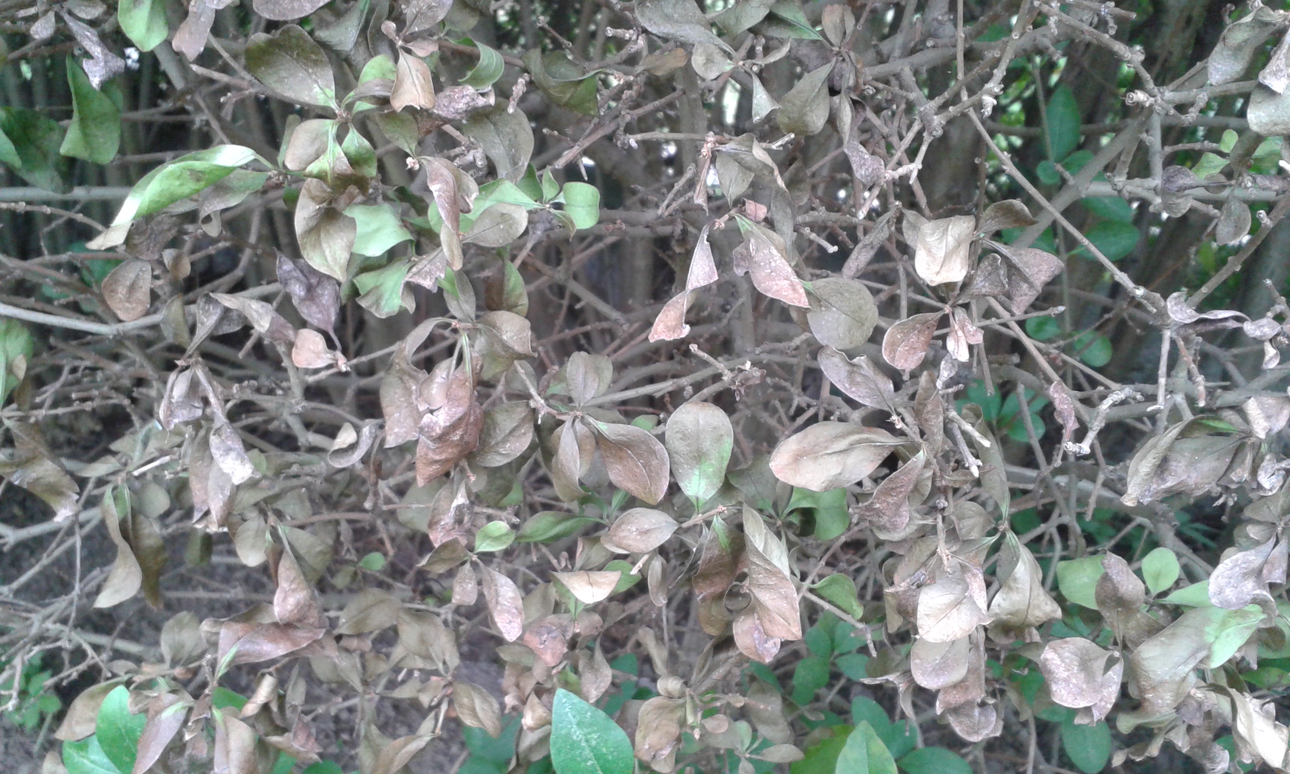 A képen fagyal látható, melyen a szélekről kiinduló foltokat és esetleg lisztharmatot látok. Atka nincs a növényeken. Szeretnék közelebbi képet, mert azon biztosabb lenne a "diagnózis". A fagyal pusztulásáért - tapasztalatom szerint - egy talajgomba volt felelős /Fusarium/. Ellene nagyon nehéz védekezni, bár a Previcur a foltok beöntözésével kisebb eredménnyel szolgál. Igazán hatásos a biológiai készítmény, a Trifender, azonban nehézkes a beszerzése.