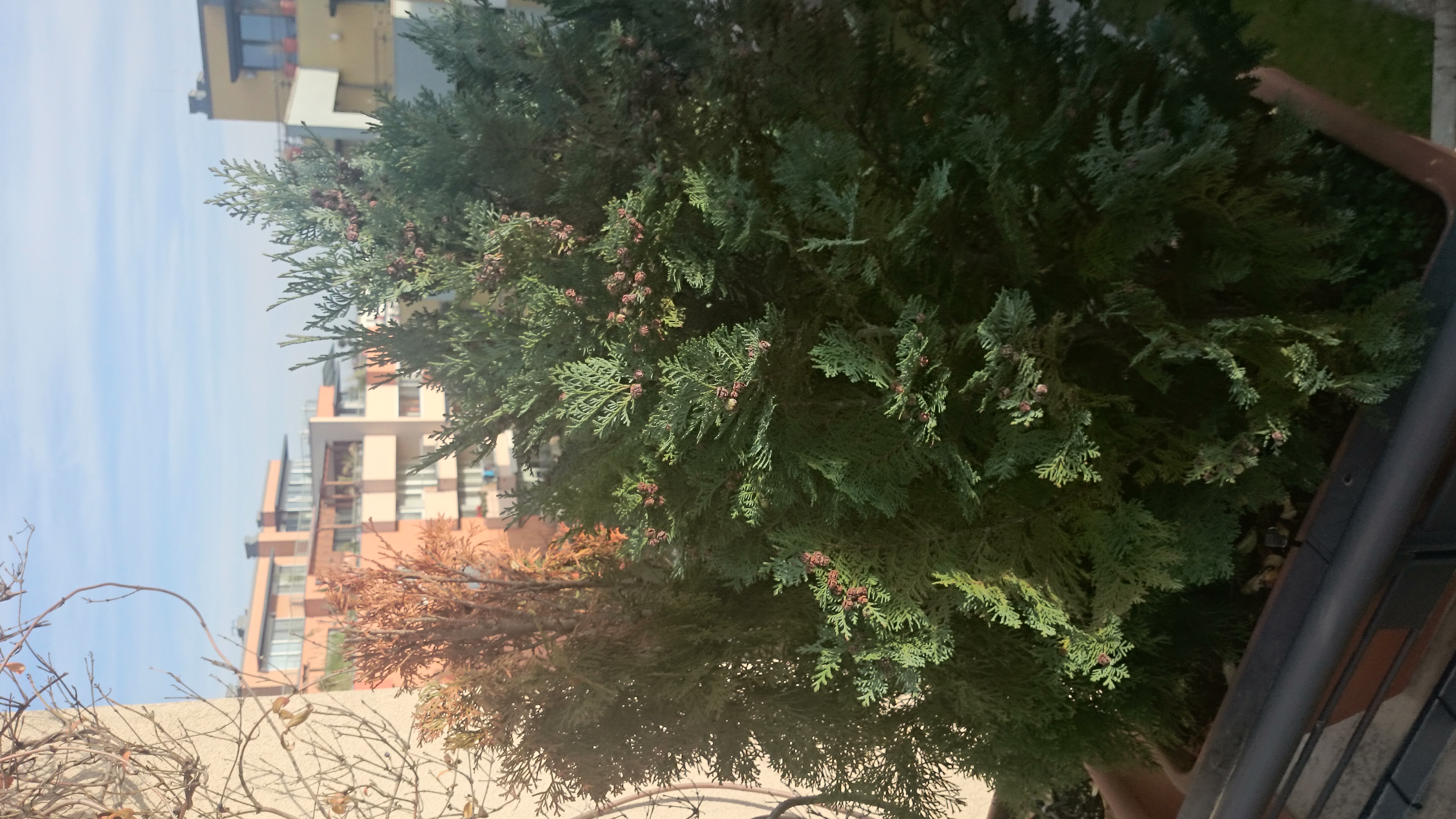 A balkonláda attól függően hány éve vannak benne a növények- nem, az ideális hely a tuják számára. A szélső növény rossz állapota a hely - széljárás, stb./ lehet a felelős. A láda felületét lazítva, új földdel célszerű pótolni, mely meszet ne tartalmazzon. Kálium-magnézium kijuttatása permetezővel vagy öntözéssel sokat segíthet.