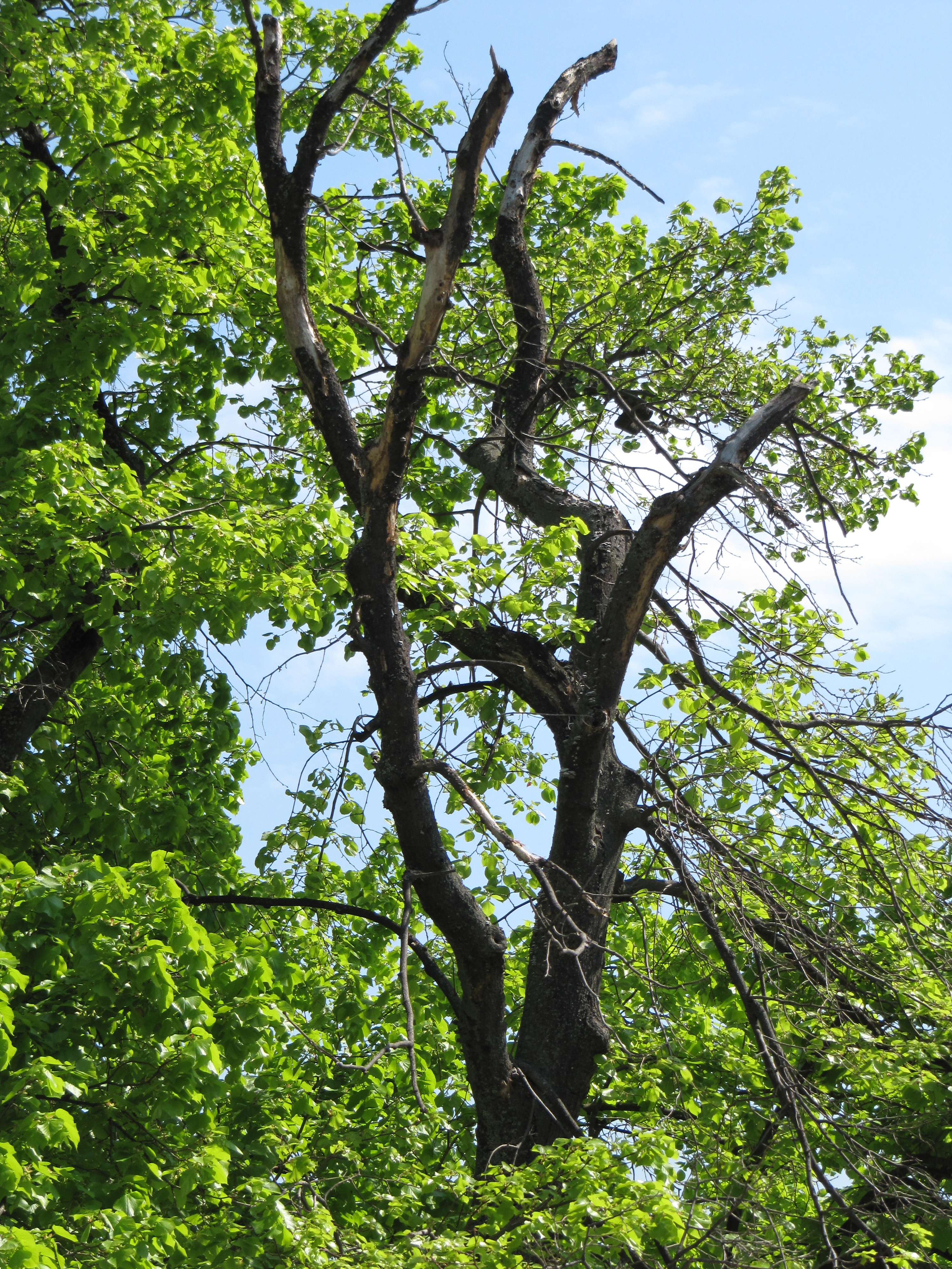 A képen látható hársfa meglehetősen idős példány. A hársra jellemző az öregkori ágszáradás, illetve a fa egyes részeinek pusztulása. Ezeket az elszáradt vázágakat el kell távolítani, így a megmaradt részek tovább élnek és díszítik a kertet. A vágási felület mutatja a gombafertőzést, mely elsősorban a farészben látható. A vágási felületet fasebkezelővel le kell kezelni /Fabalzsam vagy egyéb/. A hársak a tisztítás után általában megmaradnak. Ezt a jelenséget permetezéssel vagy tápoldatozással nem lehet megoldani, esetleg magas talajvíznél a gyökérzónáig le kell fúrni a gyökerek levegőztetése érdekében.