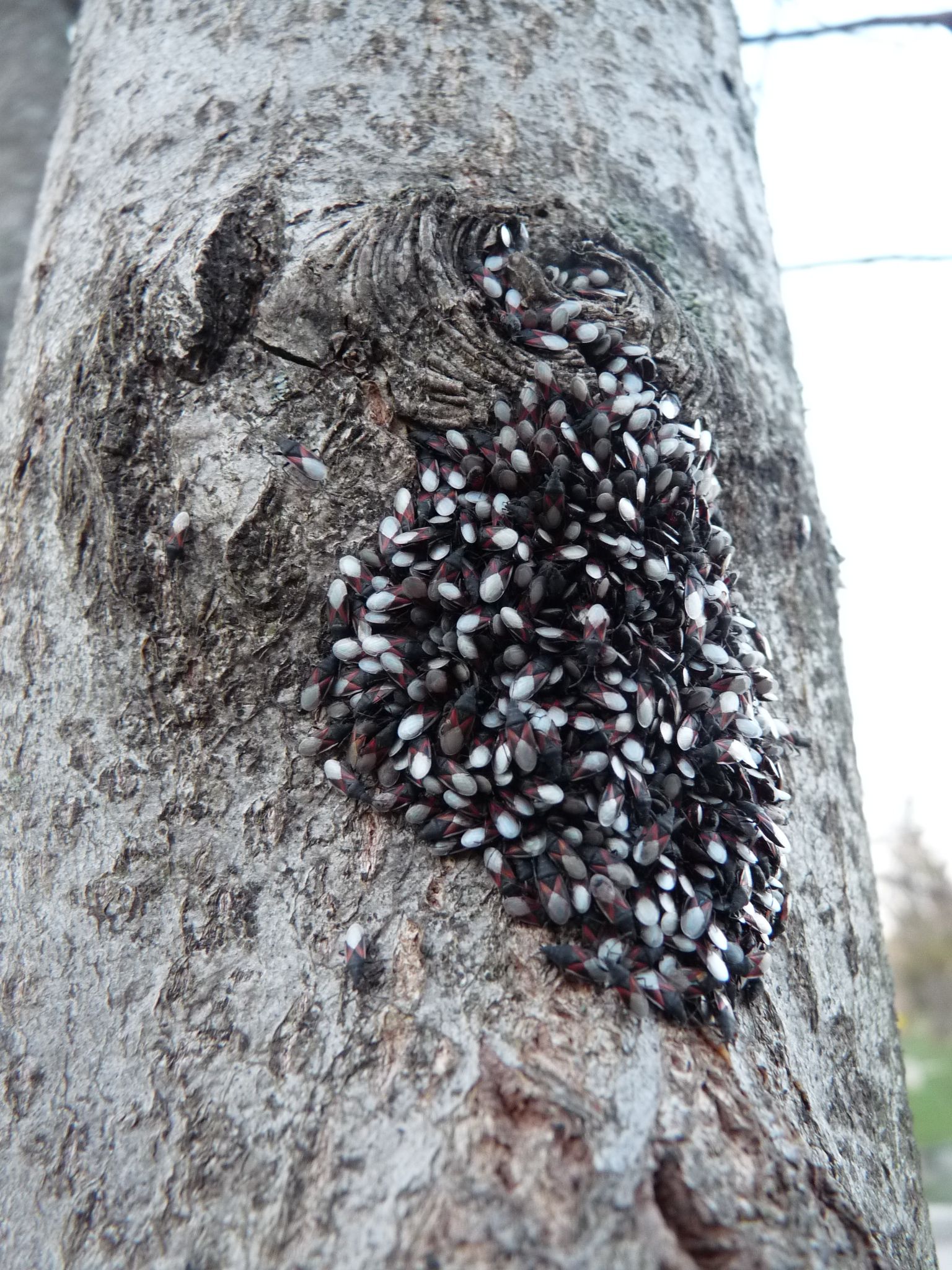 A kertünk előtti zöld területen lévő két hársfán a mellékelt képen látható kártevők jelentek meg. Az idősebb fát kevésbé, a fiatalabbikat súlyosabban támadták meg. Elsősorban a törzs déli oldalán a régebbi ágmetszések alatt telepedtek meg nagyobb csoportokban. Az idősebb fán a kéreg szélesebb repedéseiben bújnak meg.