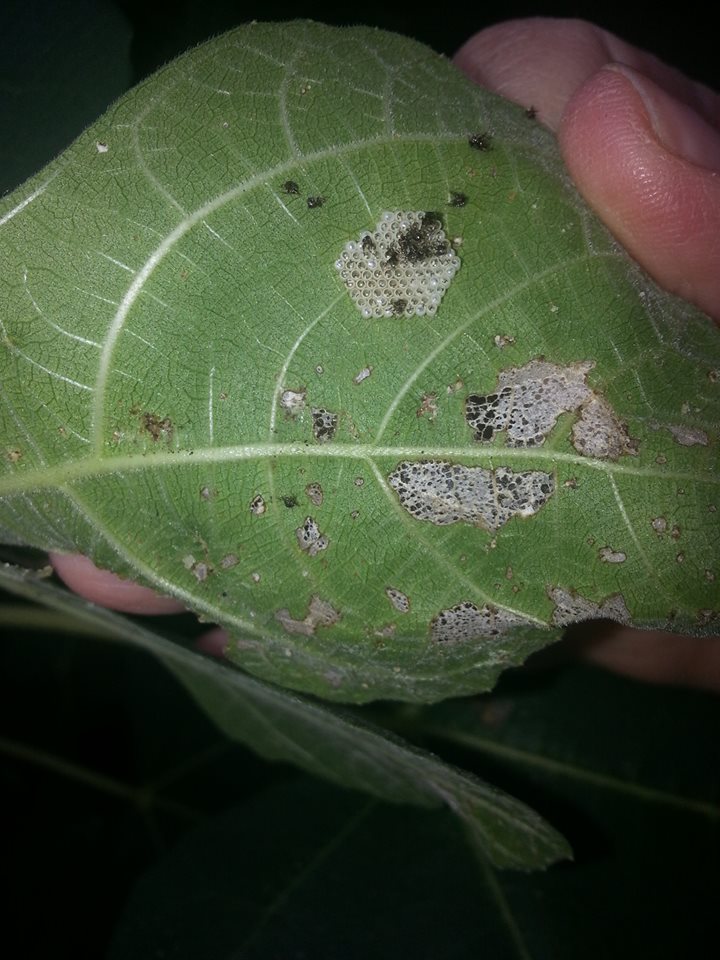 A fügebokrunkat megtámadta valami kártevő. A levelek felületén fehér foltok jelennek meg, melyek egyre növekednek, aztán apró lyukak tömkelege, végül eltűnik a levél nagyrésze. Ma hajnalban ezt a felvételt csináltam az egyik levél fonákjáról. Olyan, mint egy mikro-miniatűr fehér méhkaptár, és nagyon apró rovarok mászkálnak rajta. Valószínűleg ők a tettesek. Mi lehet ez, és hogyan lehet védekezni ellene? Köszönök szépen minden információt. Csaba