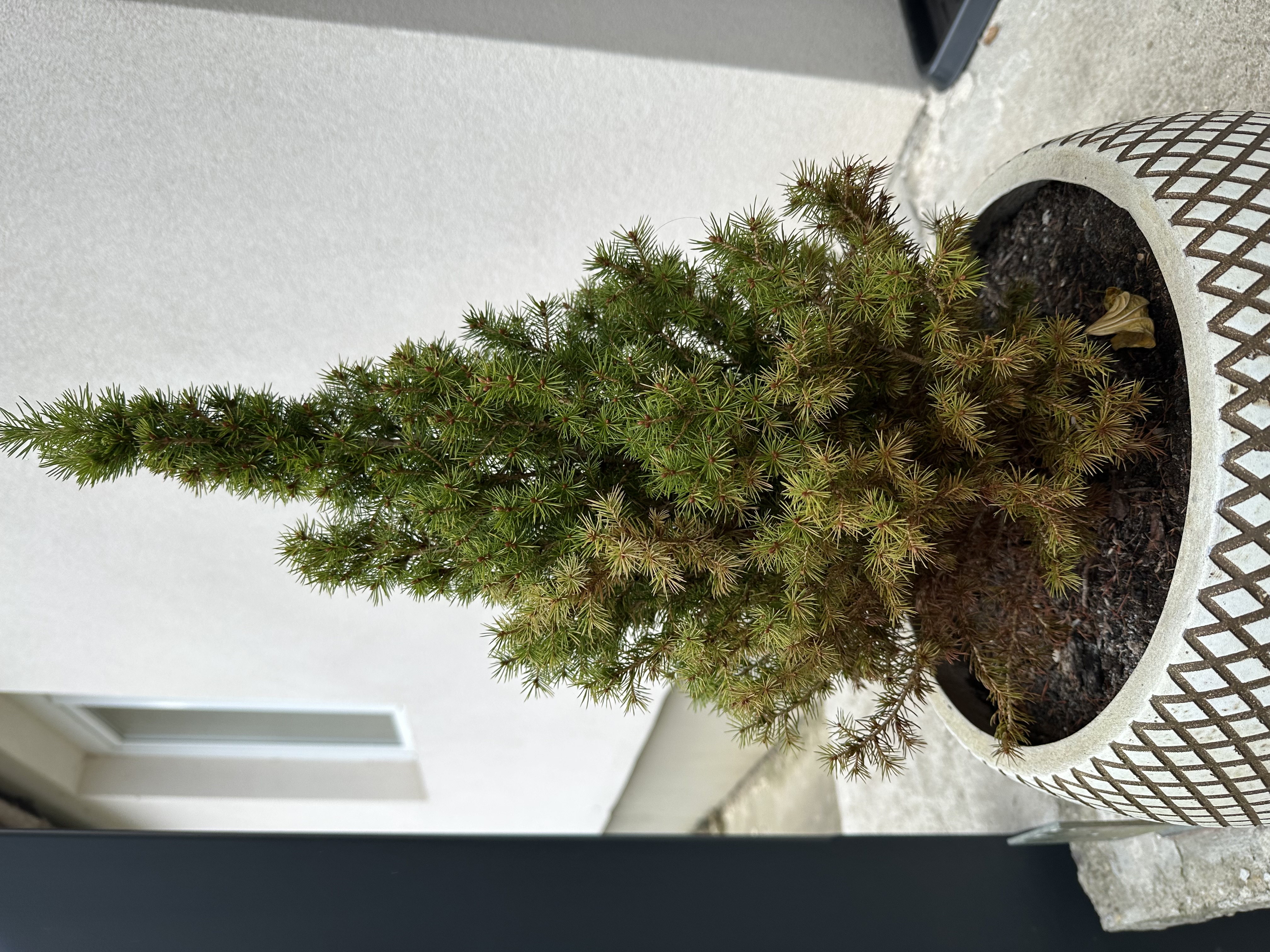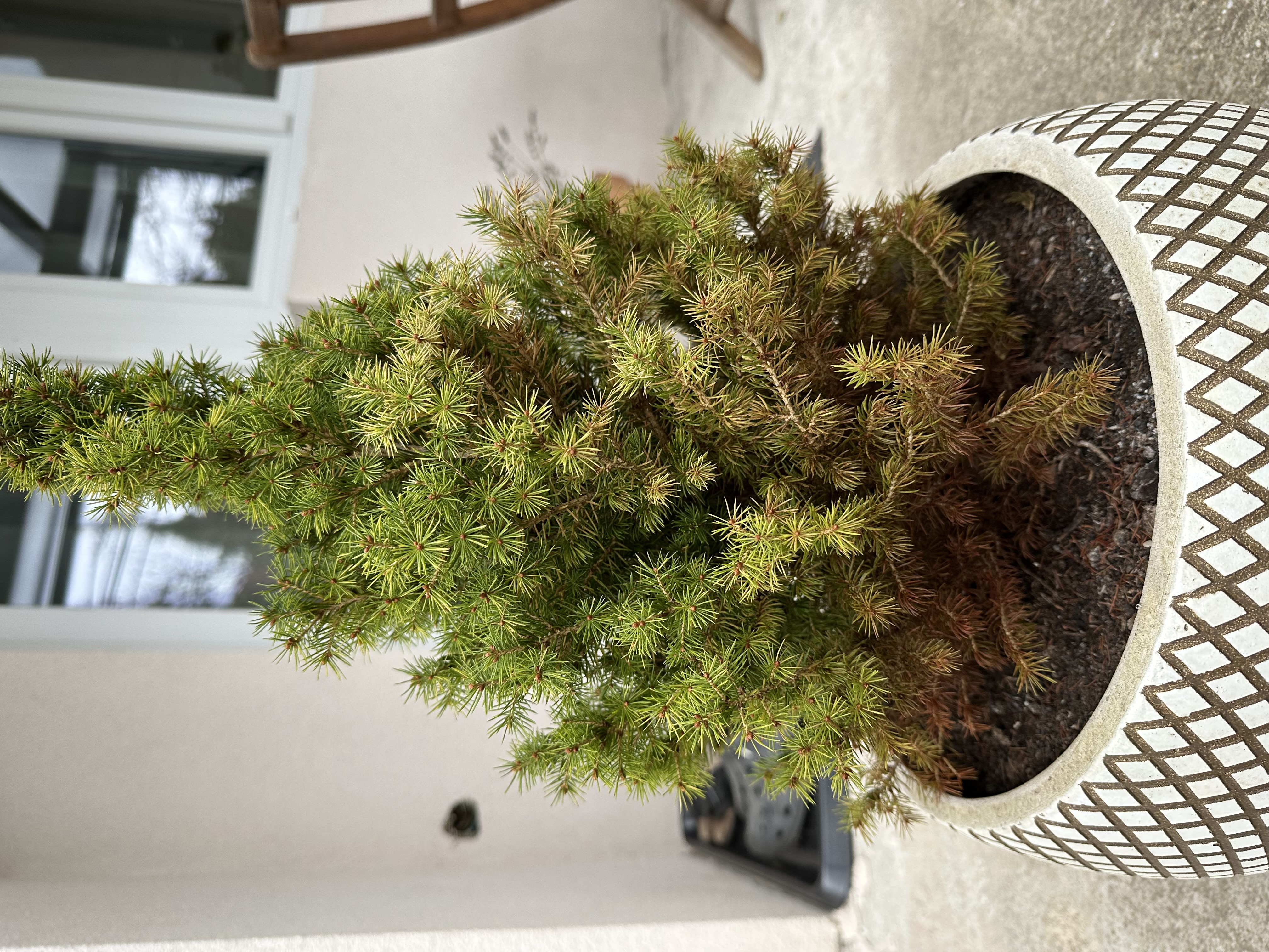 Számos oka lehet a tűlevelek barnulásnak, hullásának: atka, gomba, napégés, hőstressz, nyáron átforrósodott edény. A növény tápanyaghiányos. Edényben tartva nehezebb a számára ideális körülményeket biztosítani. Tartós hatésú fenyőtápot javaslok sekélyen bedolgozni a talajába tavasszal. Télen ne öntözze túl.