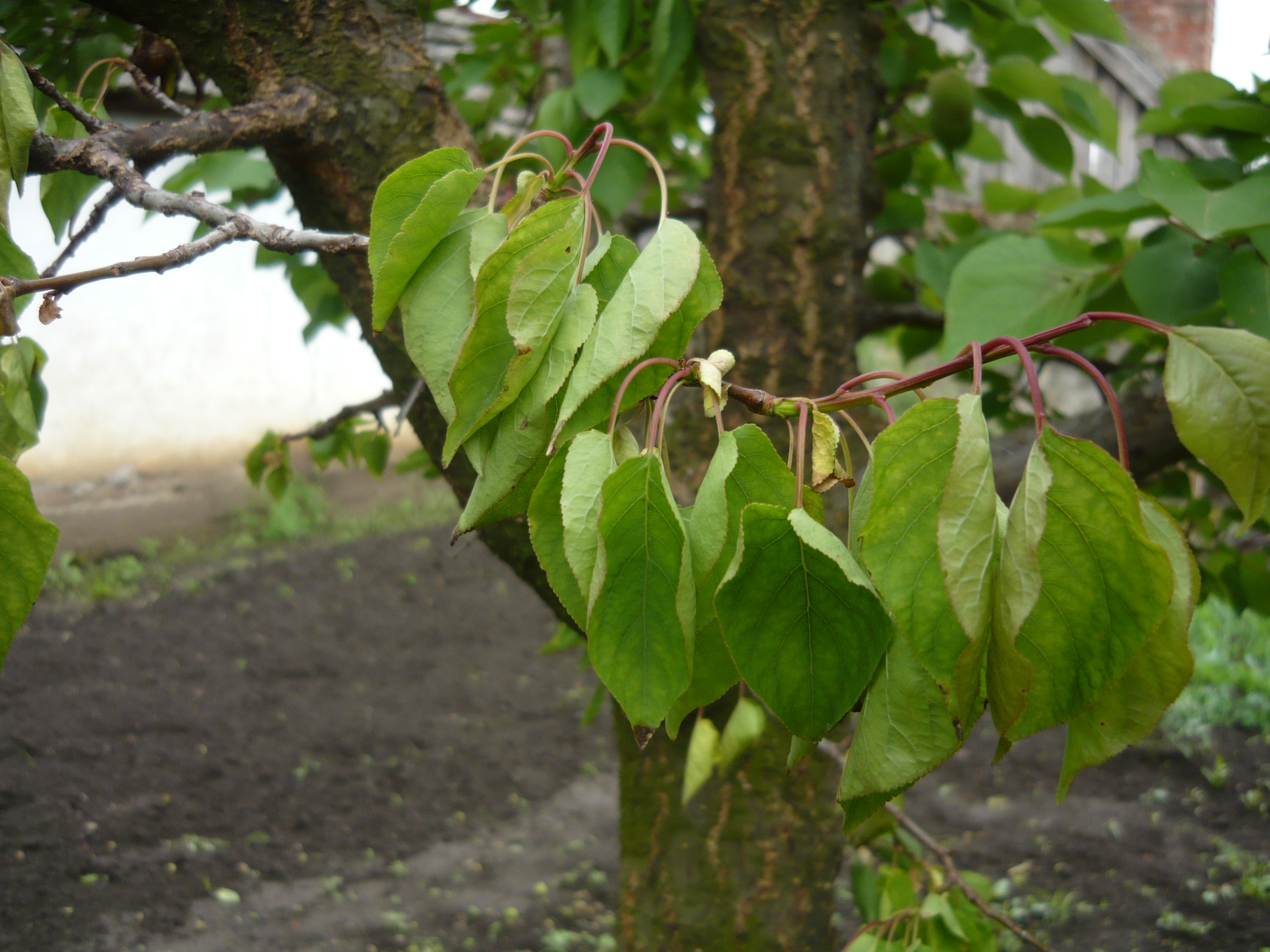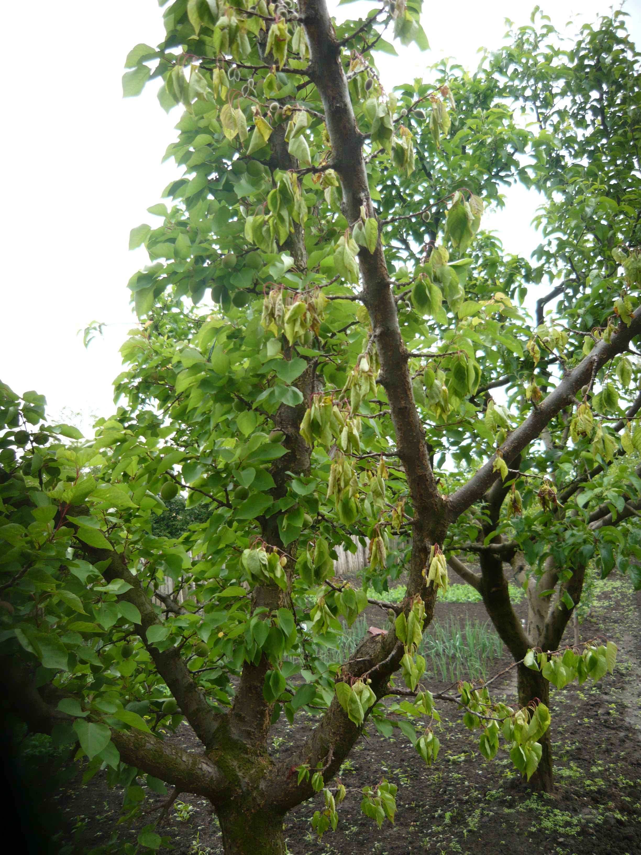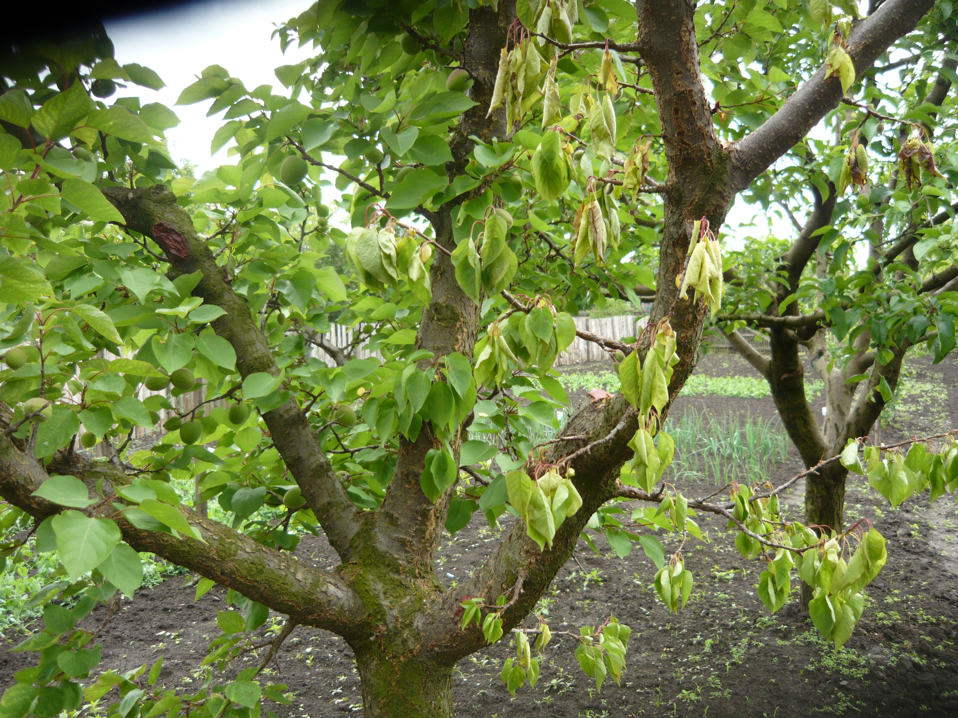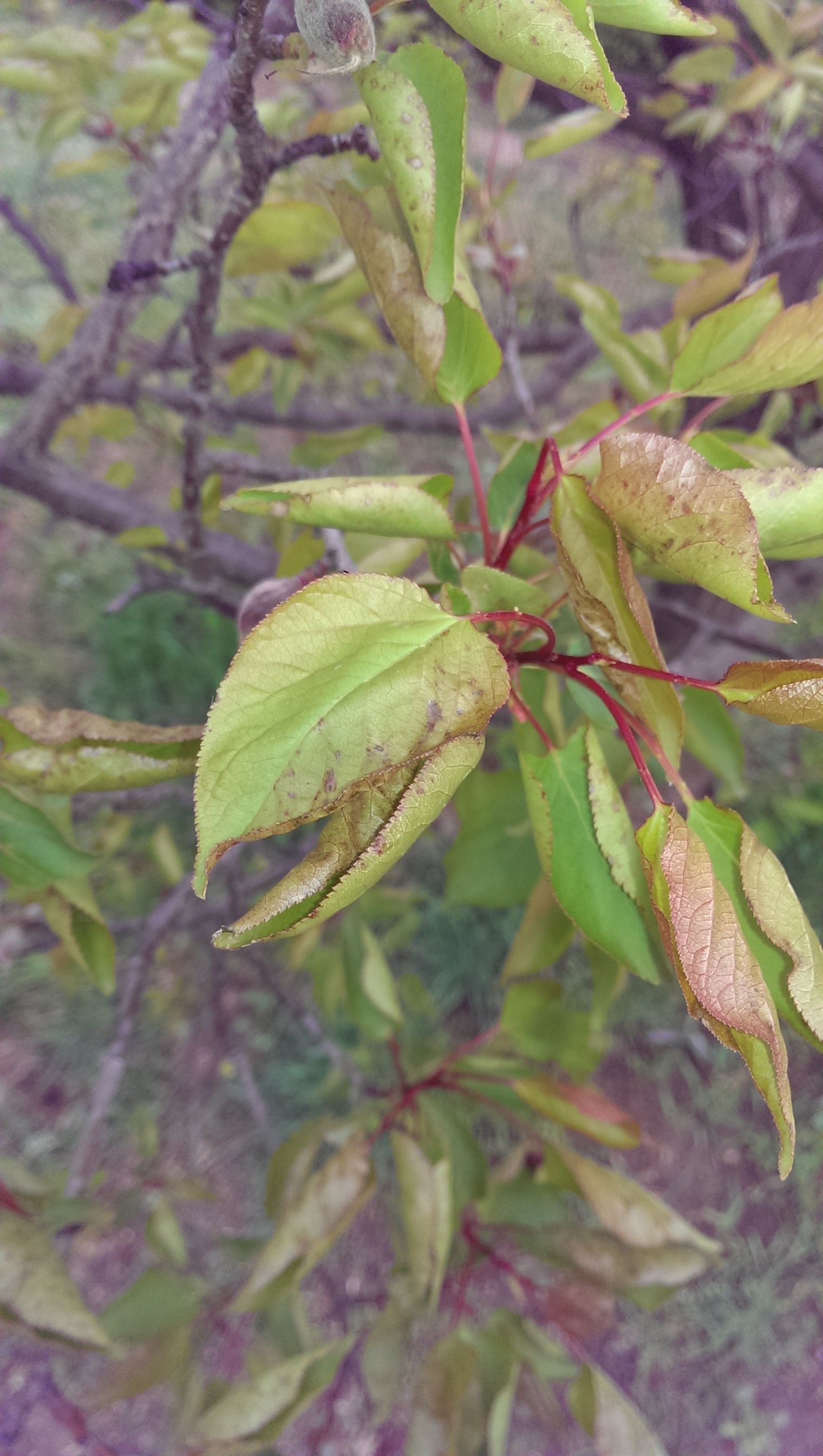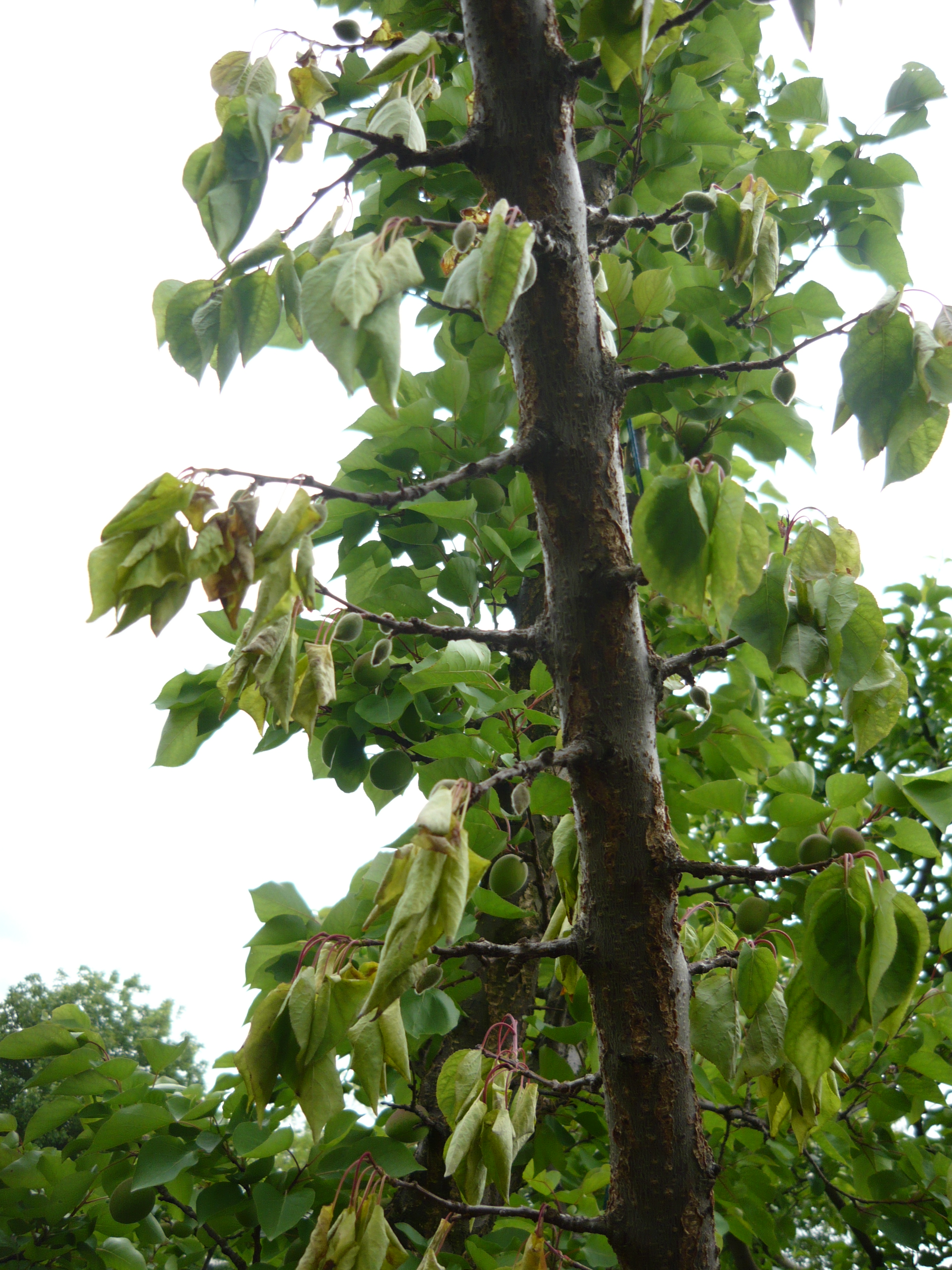 A kajszifam againak kb. 30%-an a levelek fonnyadtan lognak. Tavasszal lemoso permetezes volt,a viragzas alatt 2x Topas + 1x Chorus,majd utana kb. 2 het mulva Dithane+Decis keverek. Rovarkartevo nem lathato.