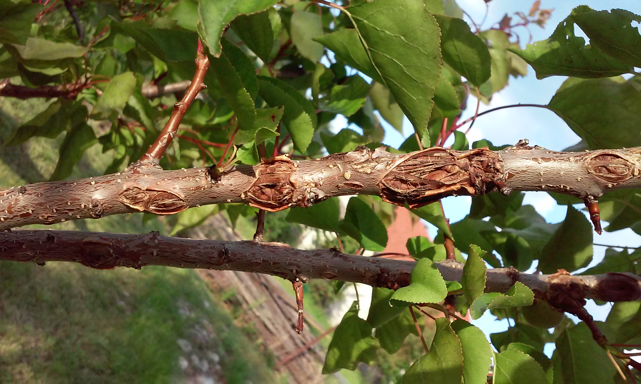 Aránylag fiatal, 5-6 éves sárgabarack fánk törzsén és ágain találtam idén a fényképen látható tüneteket. Mintha lukat vágtak volna bele. Sok apró és pár nagy ilyen folt van a fán. Mi támadta meg? Mivel tudok segíteni rajta? Köszönöm szíves segítségét!