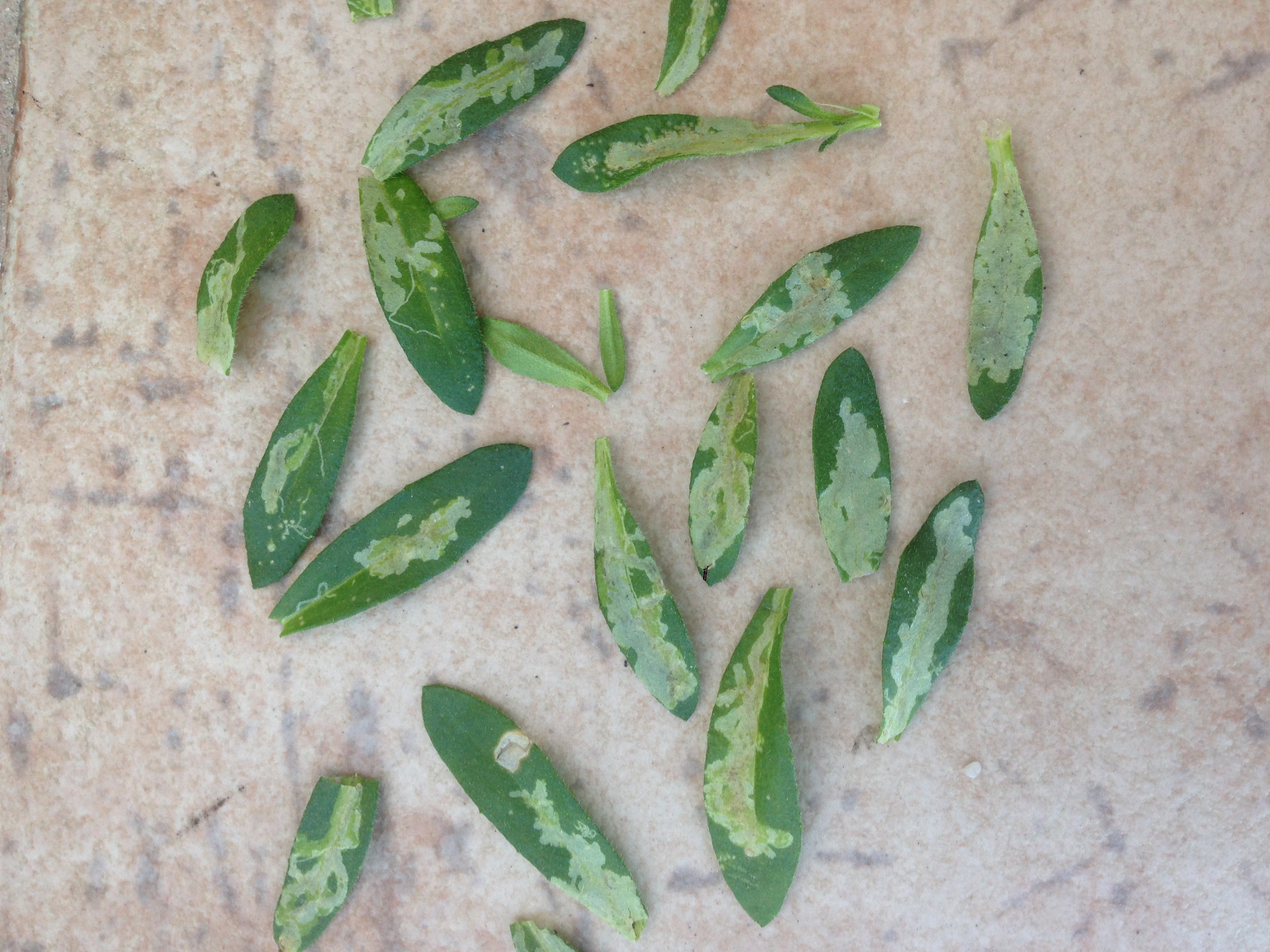 A leveleken aknázómoly kártétele látható. A kifehéredő részeken a hernyó által kirágott járatok láthatók, a fekete pontok pedig az ürülékük. Amennyiben lehetőség van, akkor gyűjtse be a fertőzött leveleket és semmisítse meg, vagy pedig felszívódó rovarölőszerrel érdemes lepermetezni.