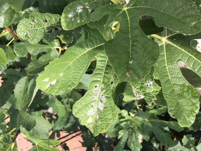 A fügeleveleken feltehetőleg a ligeti levélmoly (Choreutis nemorana) hernyóinak károsítása látható. A hernyók a füge levelein rágást folytatnak, illetve össze is szövik a leveleket. Hazánkban sajnos nincs engedélyezett rovarölőszer ellene fügében. A termést nem károsítja.
