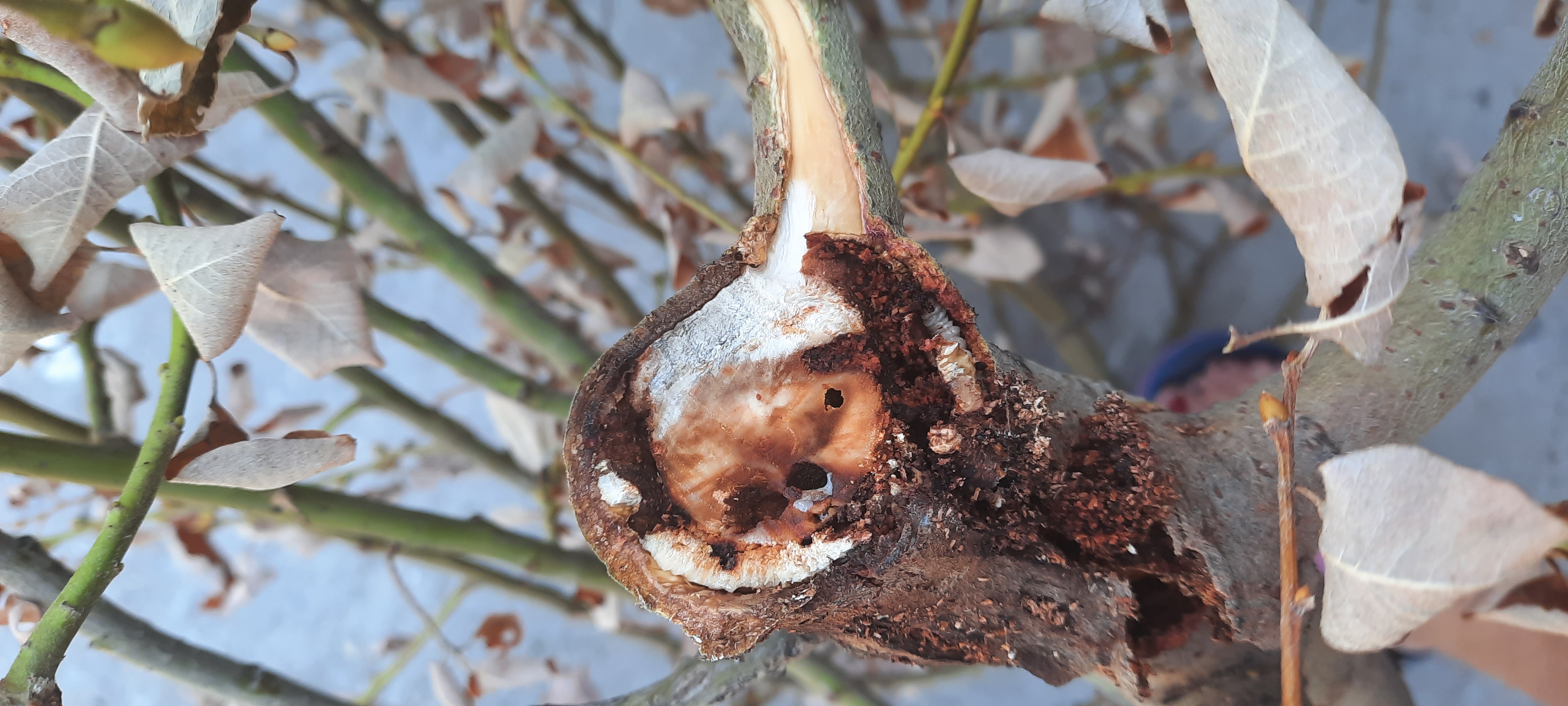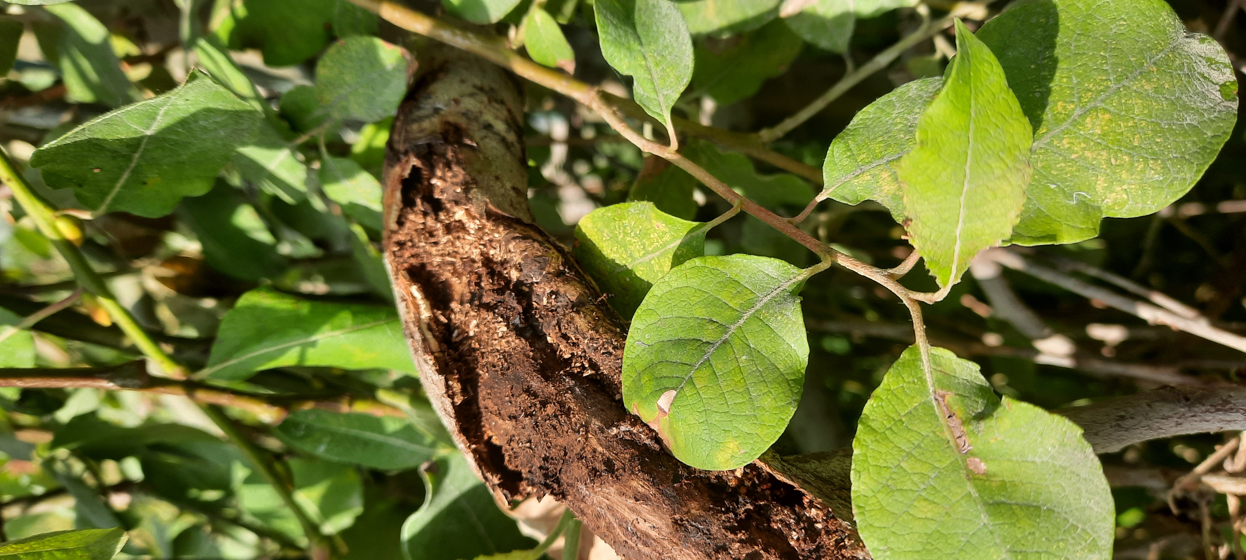 A fás rész tüneteiből biztosan megállapítható, hogy a kártevő nem szúbogár volt, hanem a lyukak mérete alapján farontó hernyó - fejlődése 2 évig tart. A sebbe lévő tojások is ettől a kártevőtől származnak.