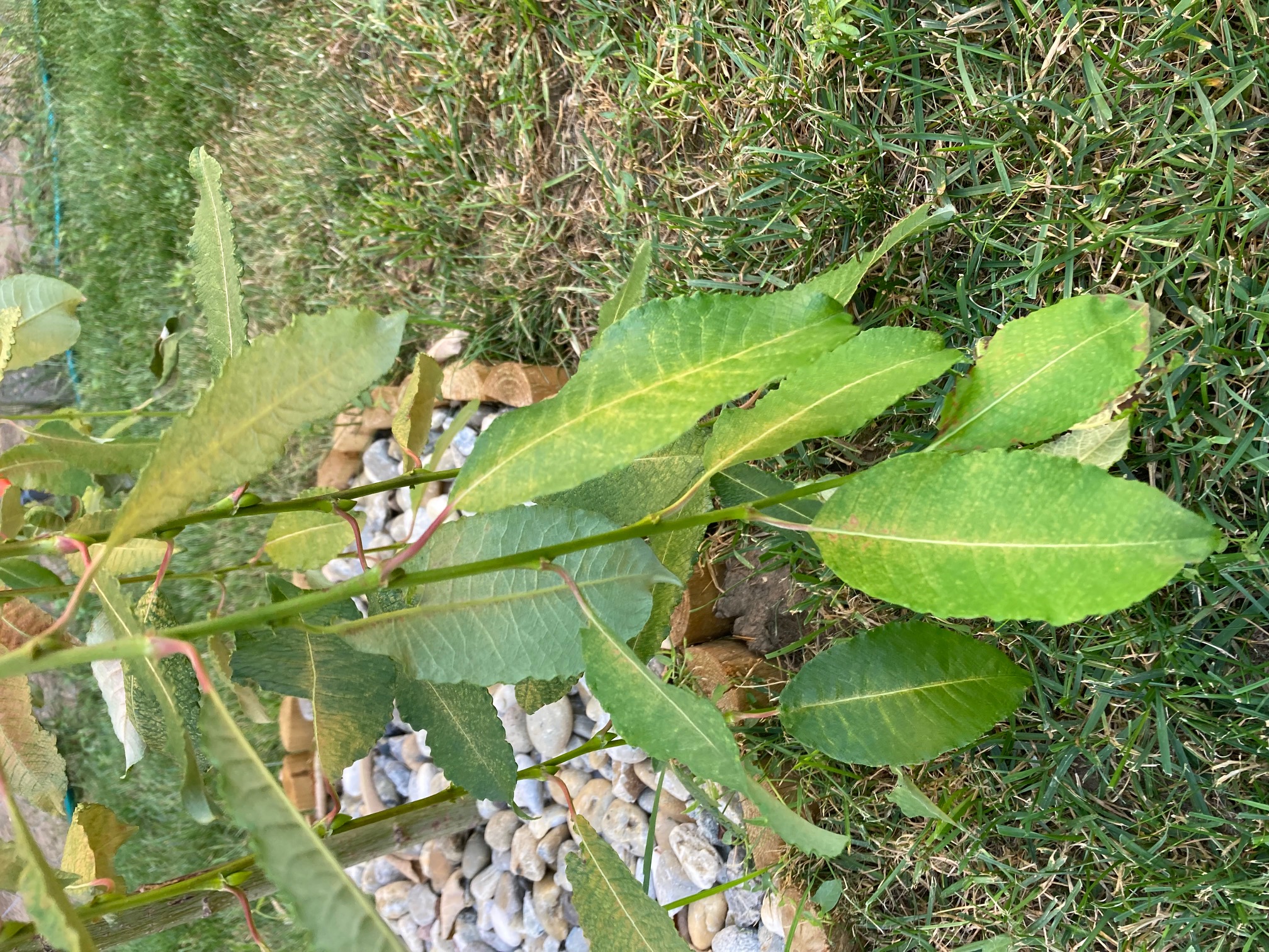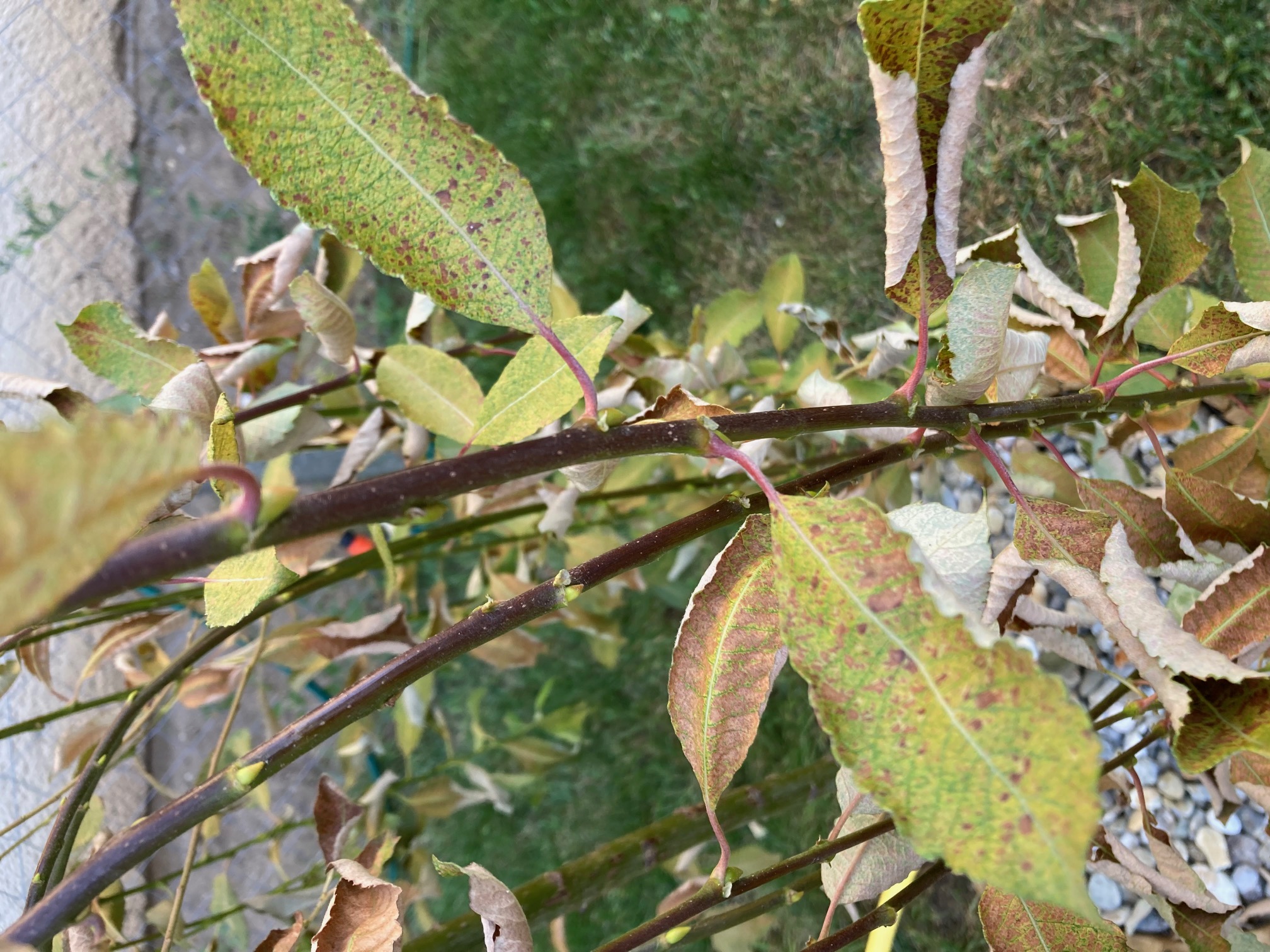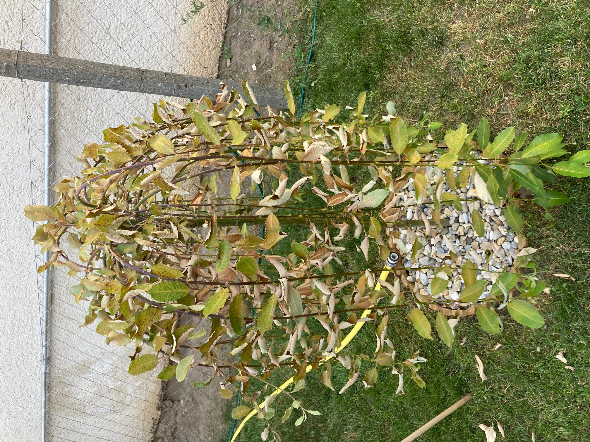 A Barkafűz dél-nyugati oldalán elkezdett száradni, locsolás ellenére is. Mellékeltem pár fotót a levelekről is. Csak a hőség lenne, gombás fertőzést külsőleg nem láttam.