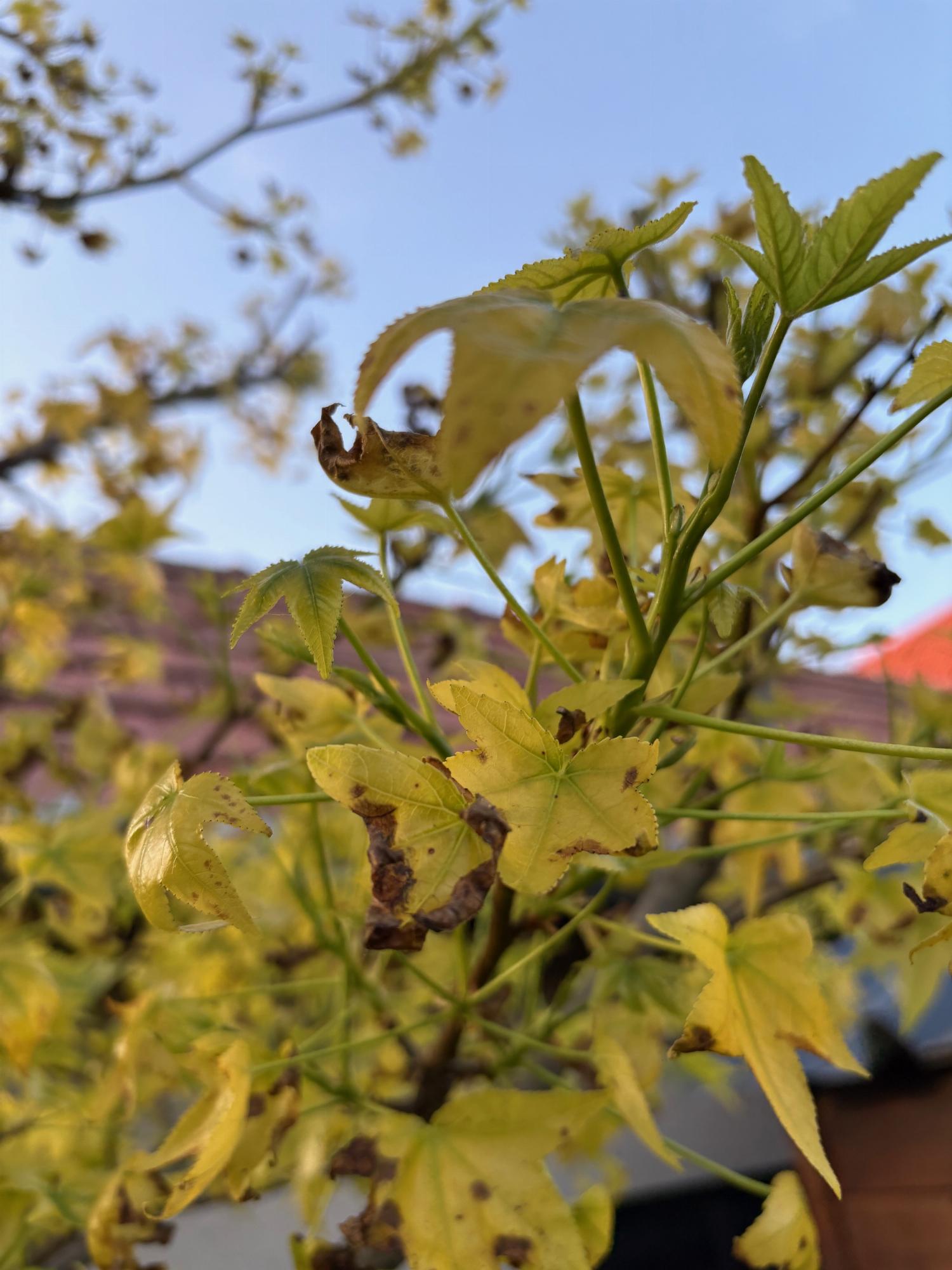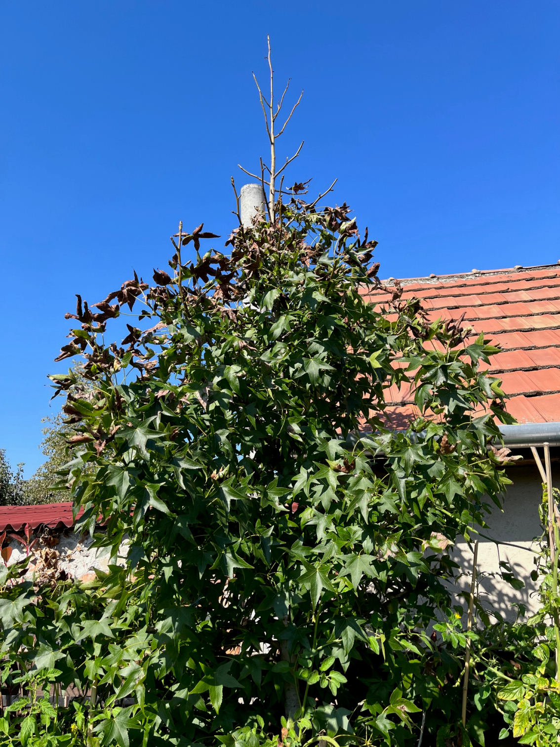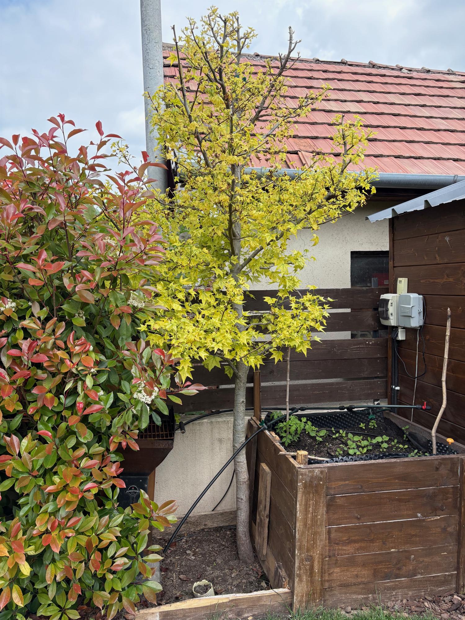 Tavaly még gyönyörű (lásd 6. sárga leveles kép) ámbrafám köré magaságyást építettem (lásd magaságyás képek) de meghagytam a fának az öntözési lehetőségét a törzse köré pedig 110-es pvc-ből készítettem védelmet. Idén augusztus közepéig még minden rendben volt vele, nyár végére azonban a csúcsától lefelé, az ágak szélétől a törzs felé elkezdtek a levelek elszáradni, bebarnulni és lehullani. A fa csúcsának ágazata is betegnek tűnik, elszíneződött. (lásd további képek)