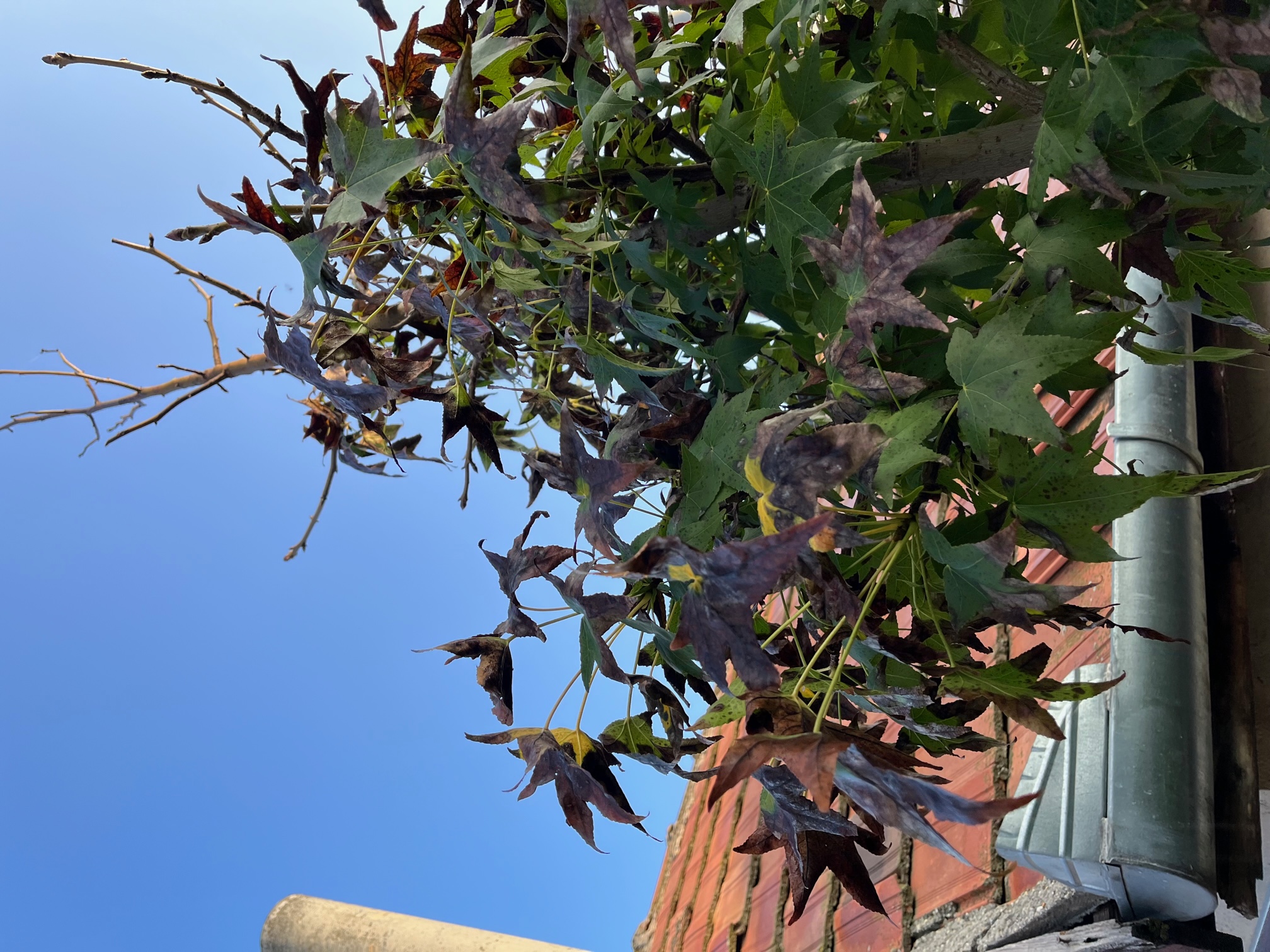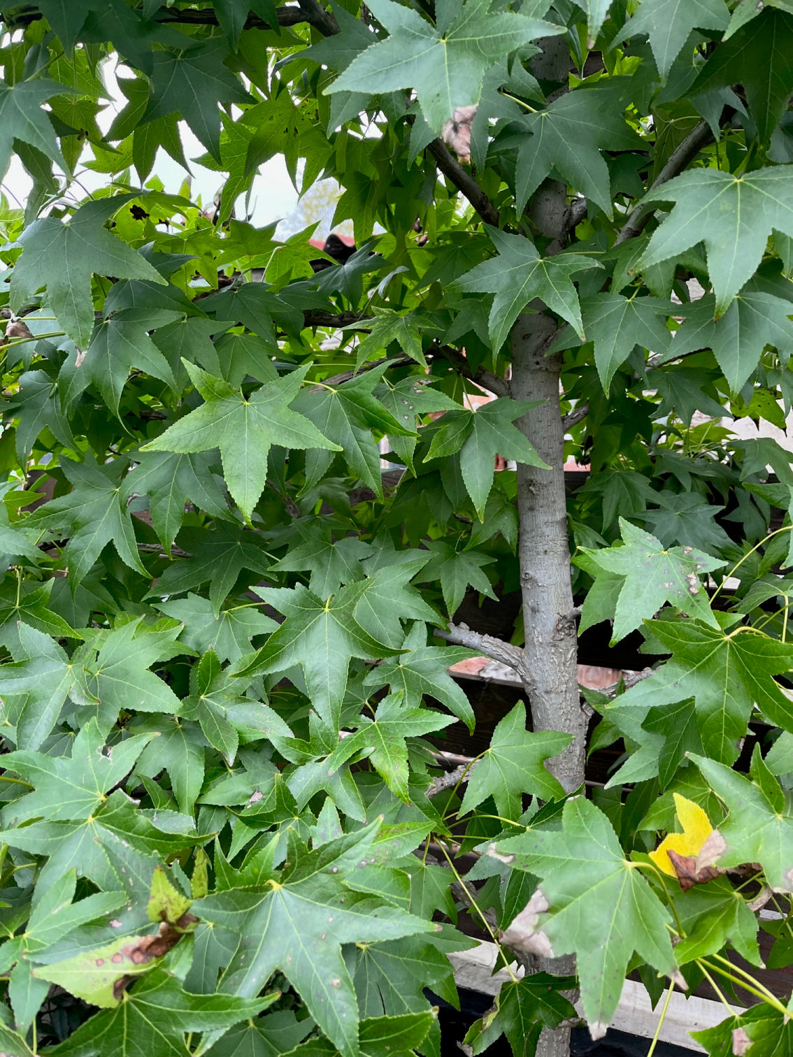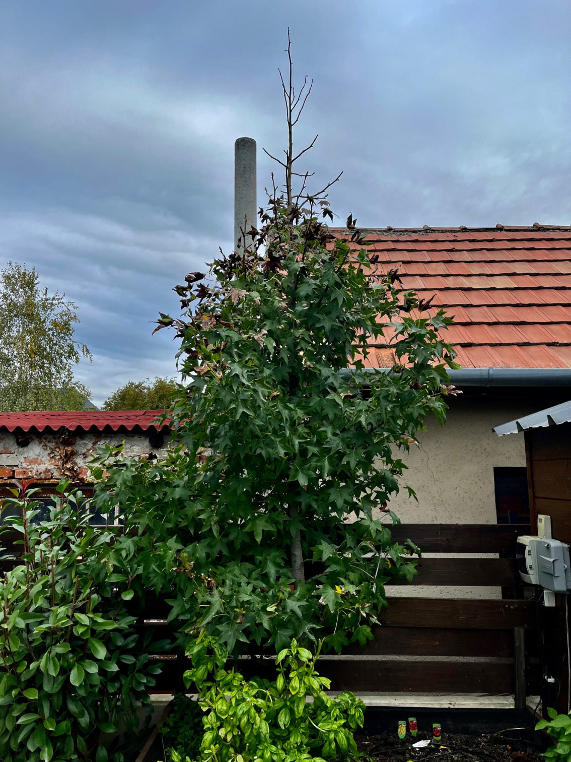 Udvar másik részén lévő gömb ámbrafa egészséges, zöld levélzetű.