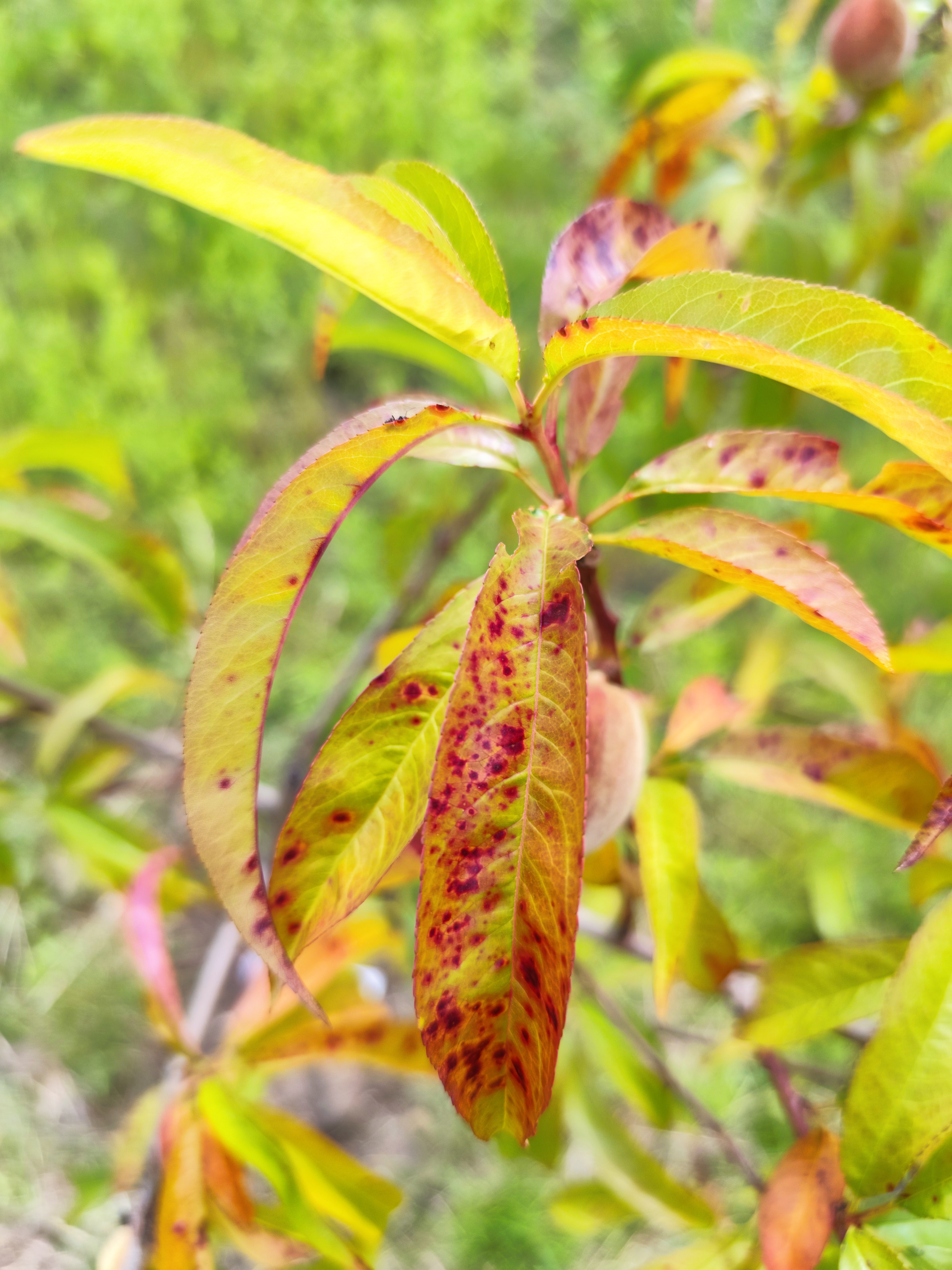 Fiatal őszibarackfa levél sárgás és piros foltok