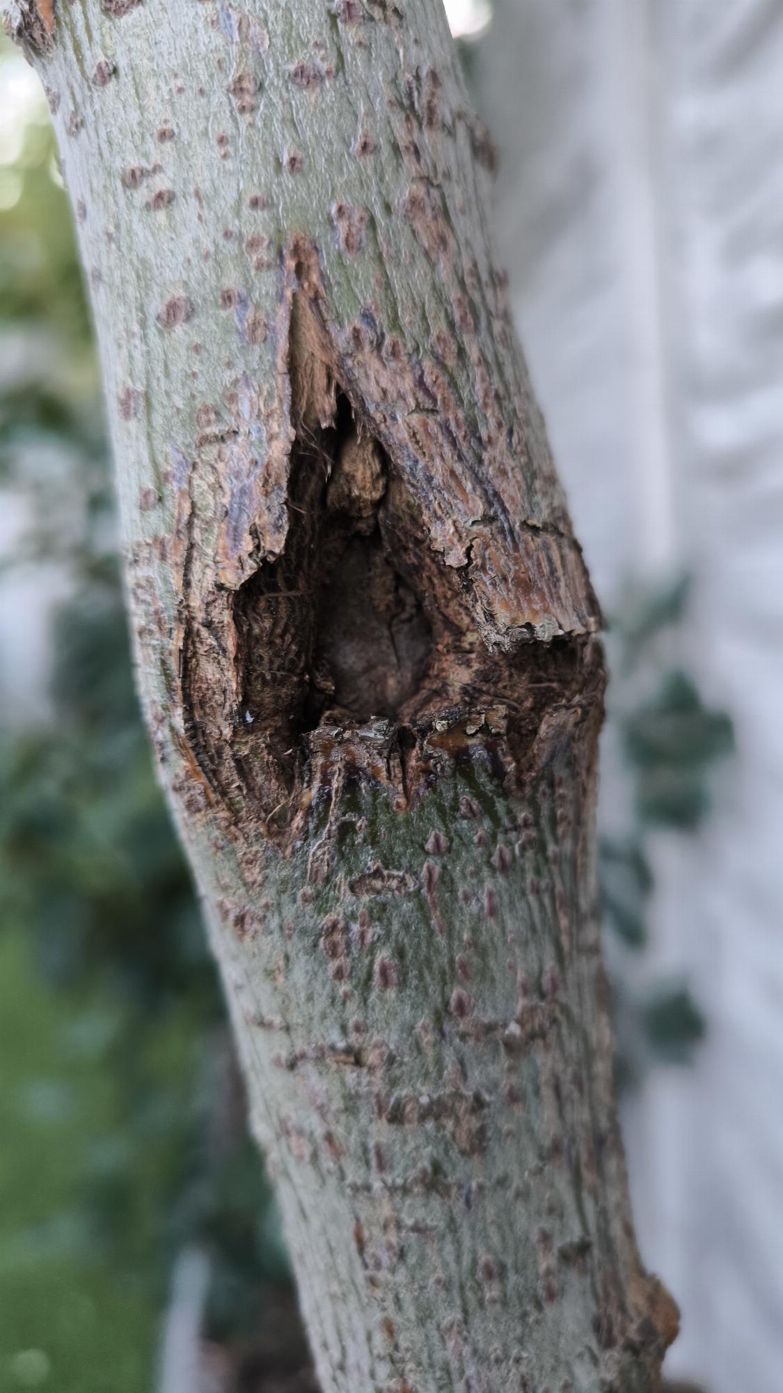 A mellette lévő fa lombkoronája elszáradt. Visszametszettem. A fa szárán sárga foltok jelentek meg.