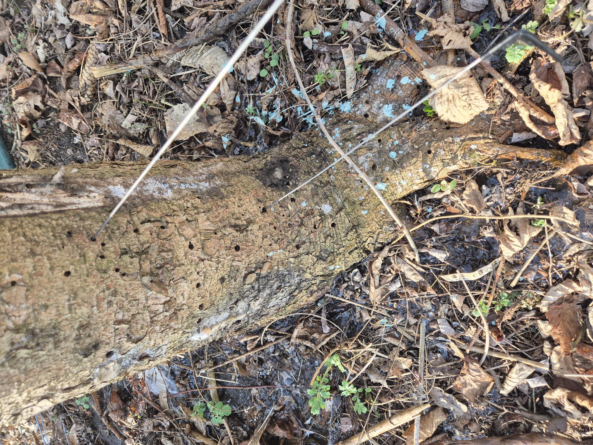 Kedves Edina! Mellékelem a képet a lucfenyőről. Két drótot raktam a lyukakba, hogy jobban szemléltessen. Most vettem észre, hogy sajnos a győkéren is vany lyuk. Pár futaot megnézten, de nem érzékeltem benne bogarat vagy ferdén fúrtak tovább.