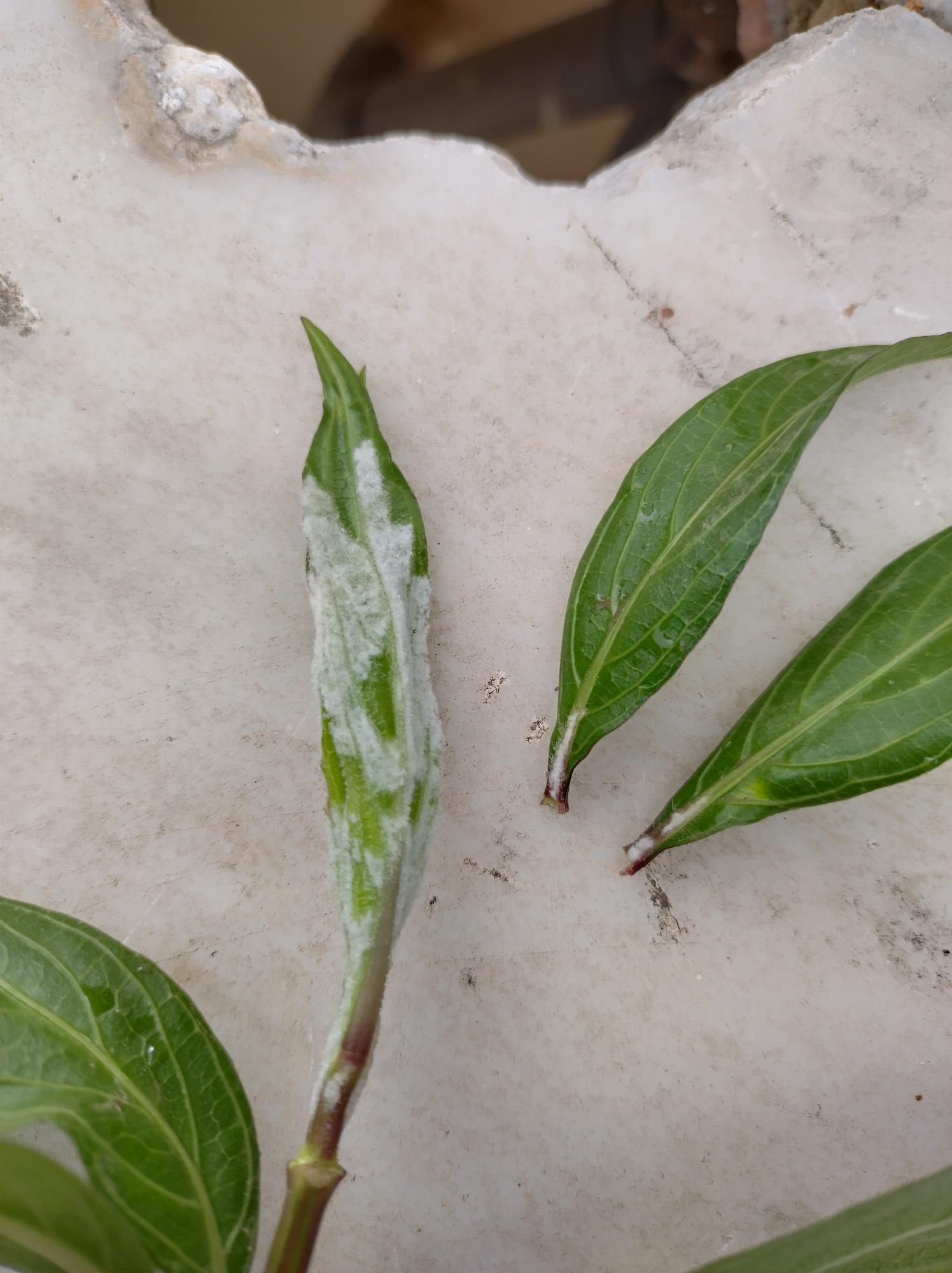 Köszönöm a korábbi válaszokat. Most a mexikói petúnia betegségével kapcsolatban van egy kérdésem. A képen látható fehér, vattaszerű fertőzés egyre jobban terjed. Jellemzően az új hatásokon jelenik meg, szinte azonnal, és hiába távolítom el a fertőzött részeket, egyre csak jönnek. Olykor az ágon is van. Ha a körmömmel nagy nehezen lekaparom, alatta egy ép levél van, ami enyhén sötétebb, talán kicsit barnás színű. Mi lehet a baja a növénynek, és milyen kezelés segíthet?