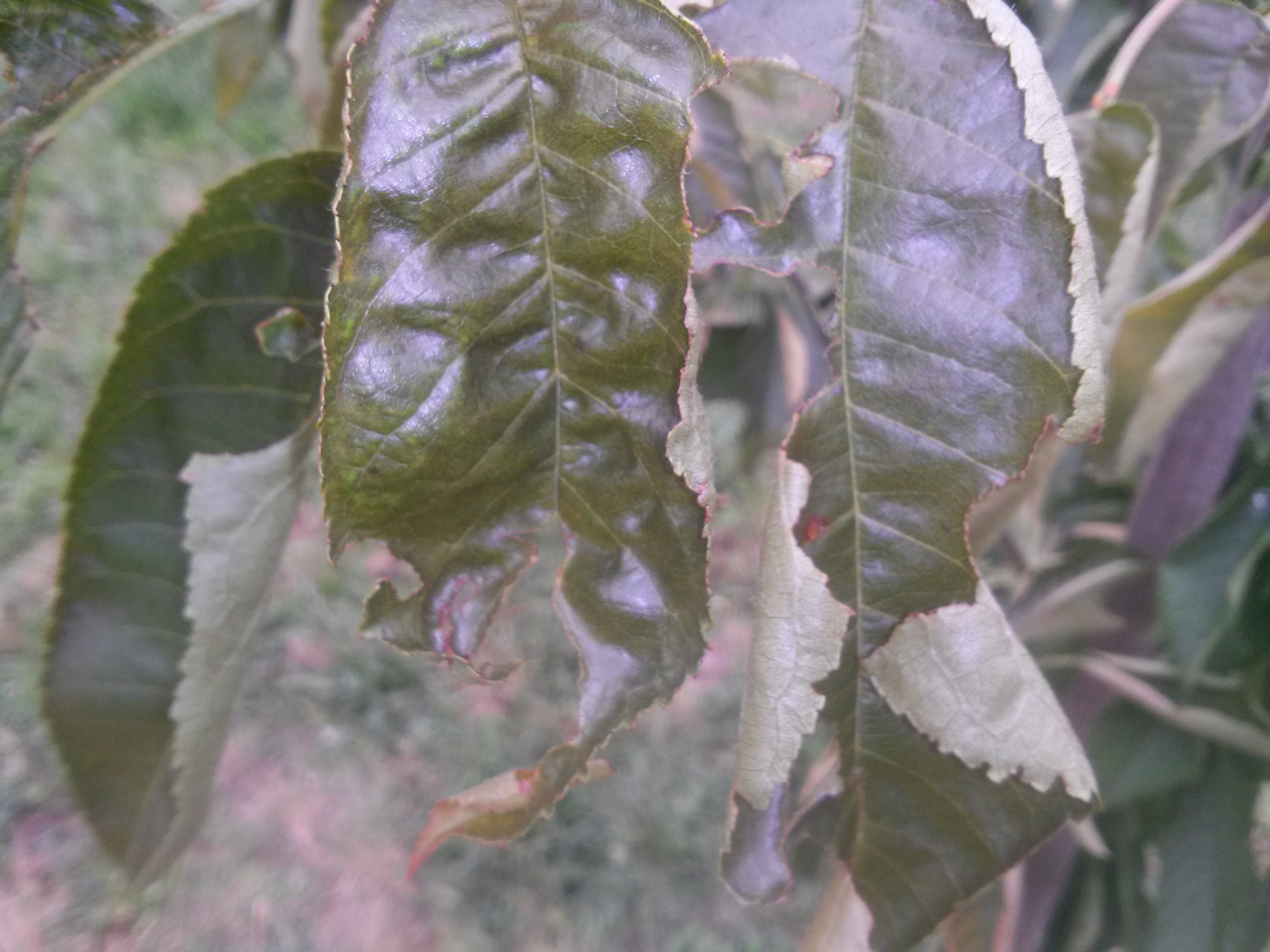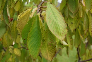 Van egy kb. öt éves Germersdorfi cseresznye fánk. Idén is a lemosópermetezést megkapta. Szépen ki is virágzott. Kb. két hete elkezdett sárgulni a levele és vörös barna foltok jelentek meg a levélen. A kis termések is megbarnultak.