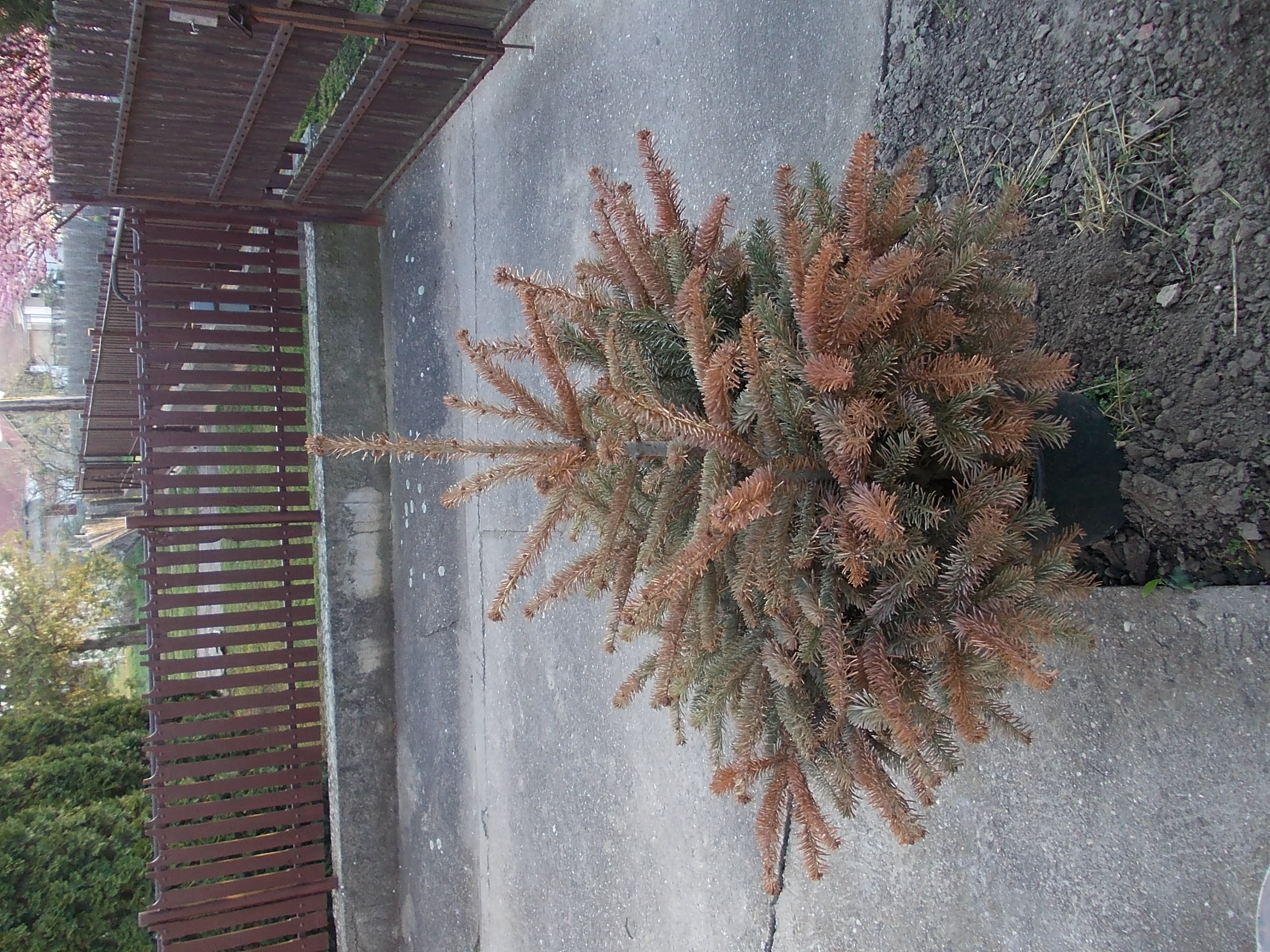 Karácsonyra vásárolt konténeresk Nordmann -fenyőnk elkezdett egyre jobban vörösödni, barnulni.