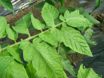 Az alábbi képen is látható levélközi sárgulás tapasztalható a fél determinált paradicsomon, ezenkívül a levelek a középső érnél kipúposodnak. Szeretném megtudni mi okozhatja, Válaszát előre is köszönöm,. Gabriella