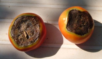 Ez a kalciumhiány okozta csúcsrothadás tipikusn tünete. Ezeken a terméseken már nem lehet segíteni, de a későbbiekben oda kell figyelni a kalciumpótlásra lombtrágya vagy tápoldat formájában.