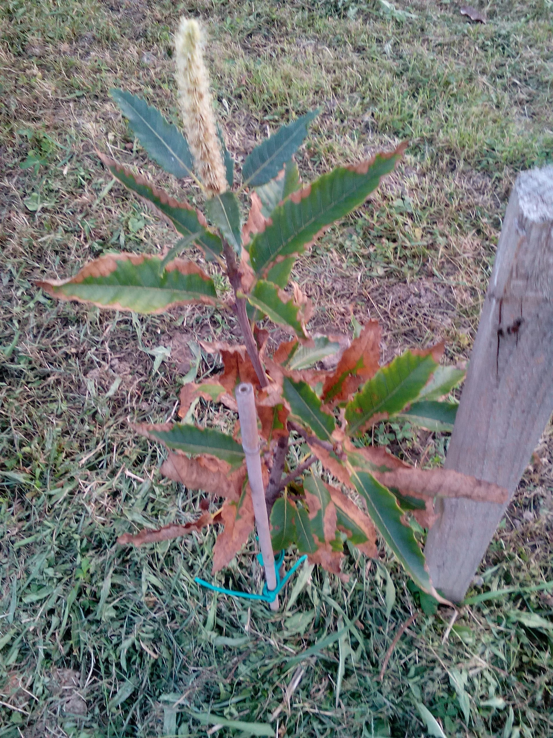 a gesztenye savanyú talajon fejlődik jól. A 6,9 - 7 ph inkább semleges. ez okozhat tápanyag hiányos tüneteket. Ez leginkább kálium. esetleg magnézium hiányra utalnak. A megfelelő kálium, kalcium magnézium arány minden növénynél fontos. Én kénsavas kálium trágyázást javaslok 20- 25 g /m2 mennyiségben a gyökérzónába bedolgozva.