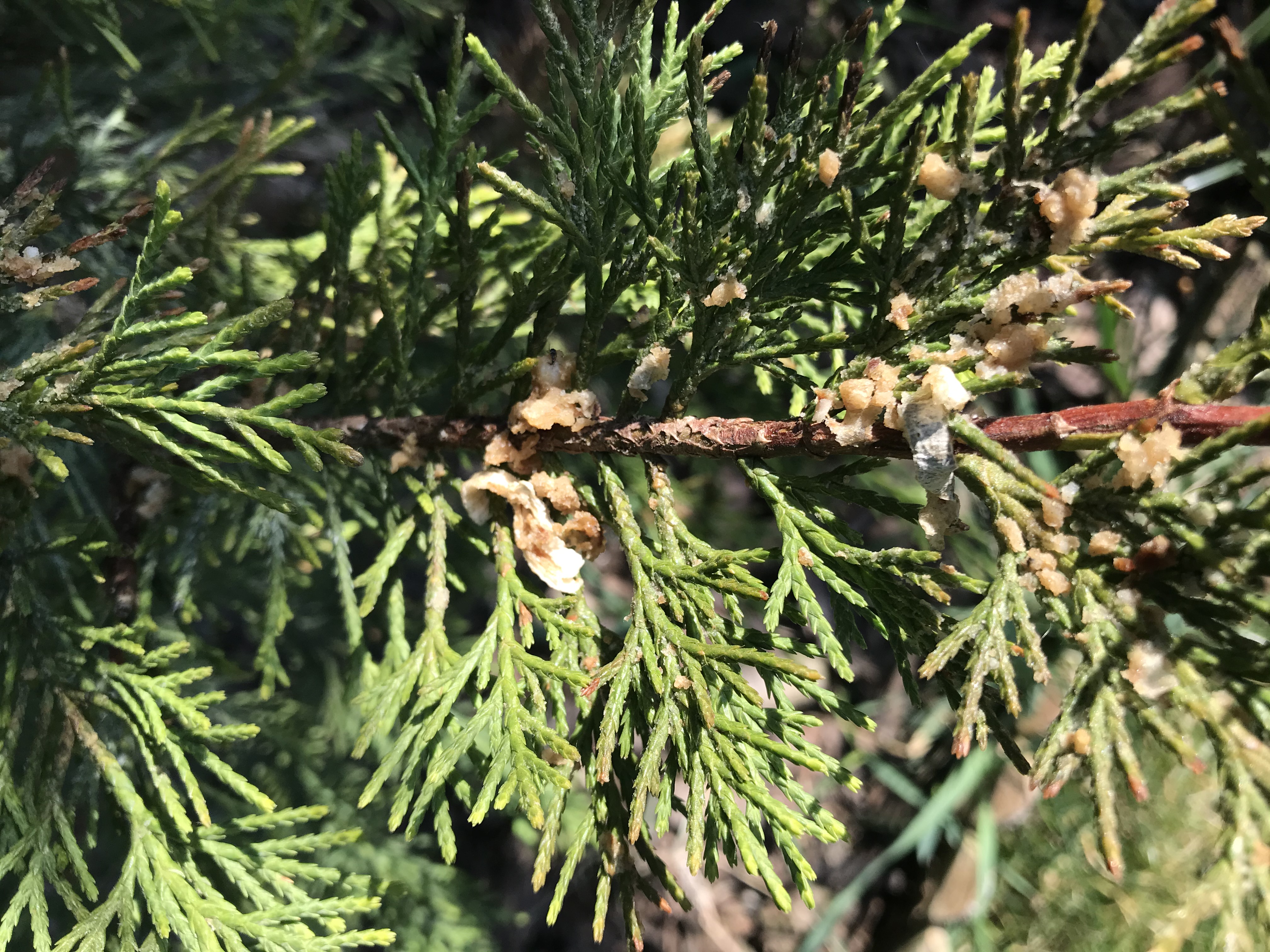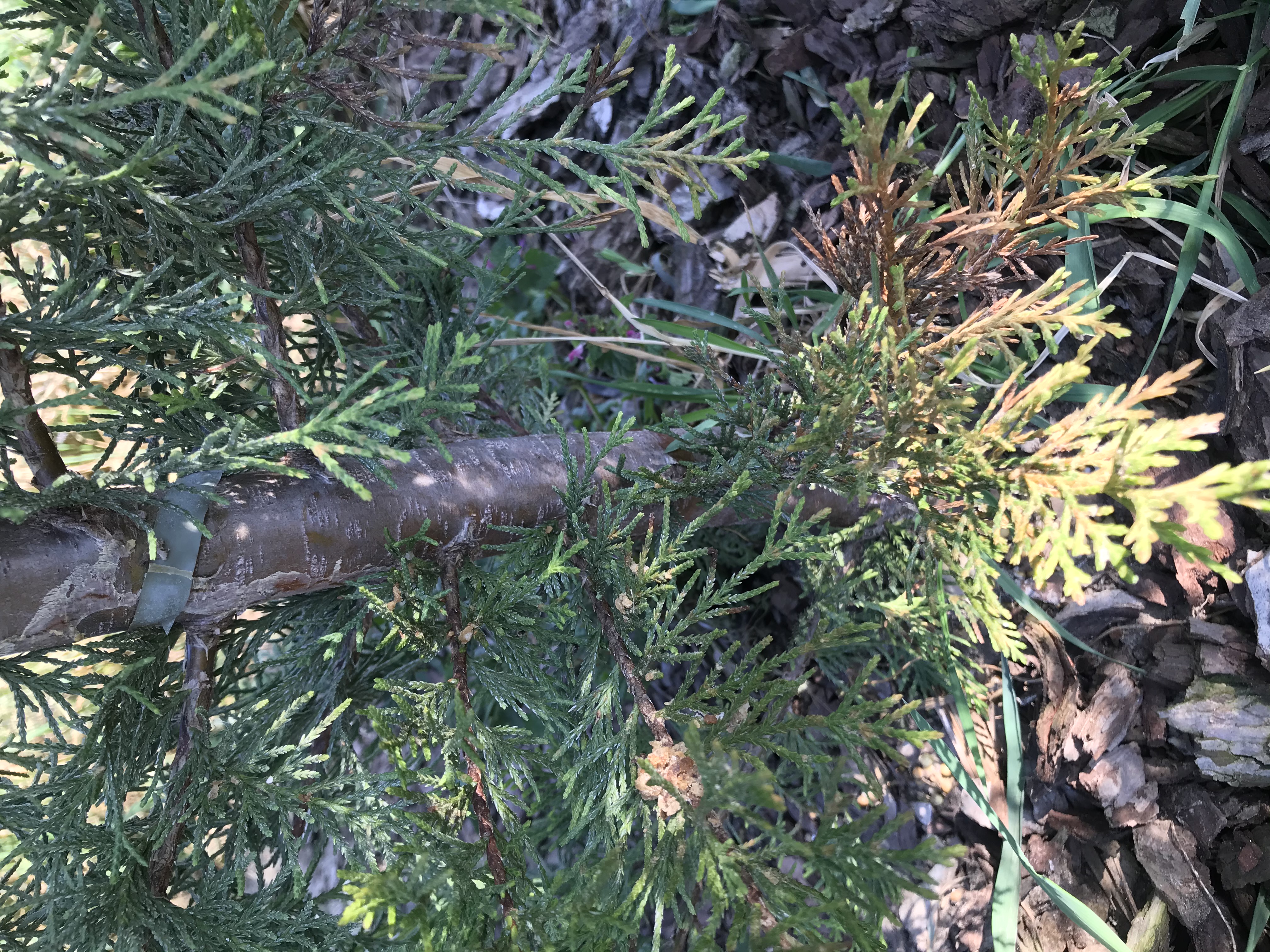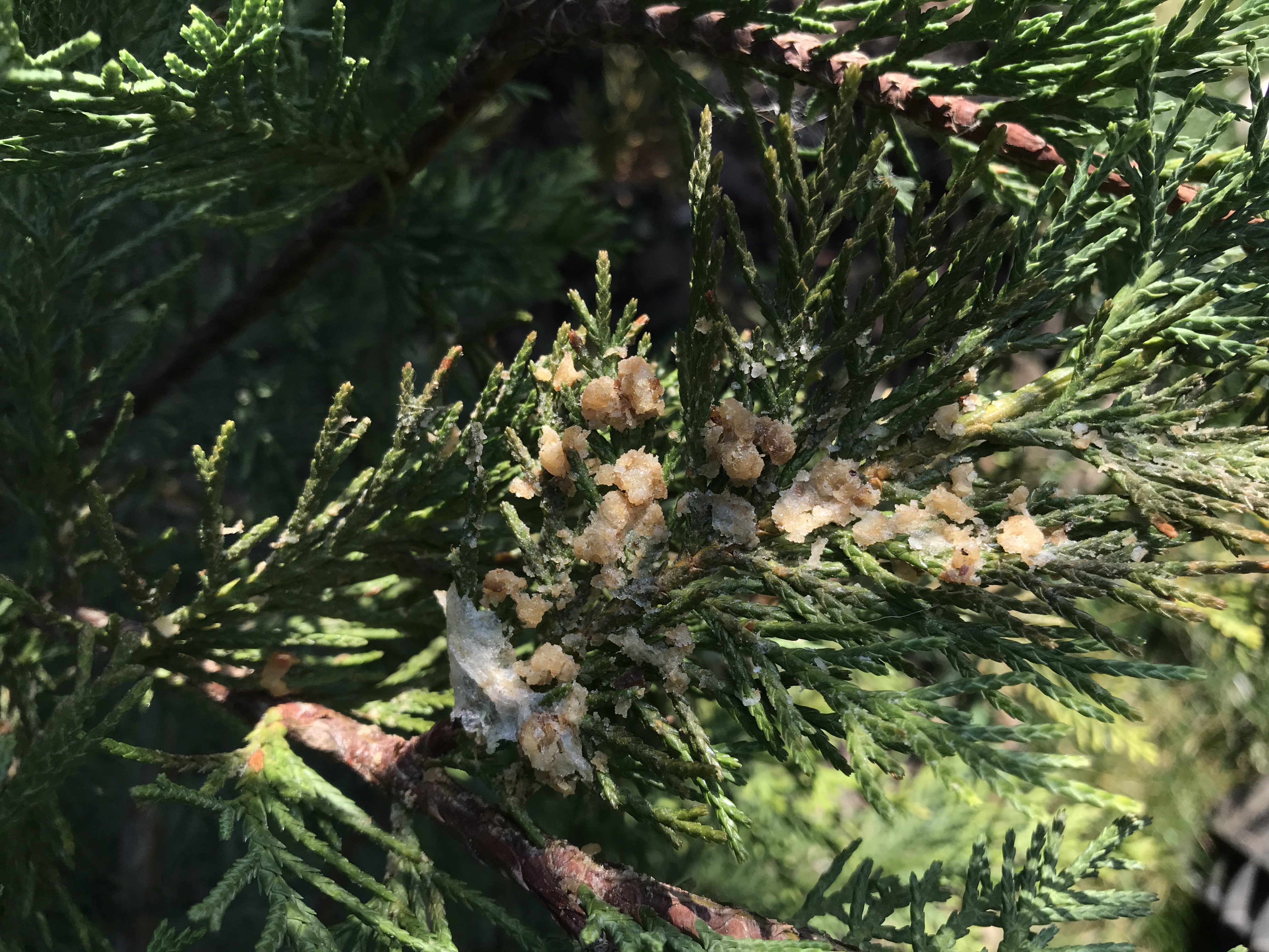 A ciprusról készült fotó közepe táján erős gyantafolyás látható. Az örökzöldek a sebzéseket gyanta-takarással akarják befedni és "gyógyítani" Oka leginkább mechanikai, de lehet kártevő befurakodása nyomán. Ezért ajánlom, a gyantát leszedve tüzetesen nézze át a károsodott részt
