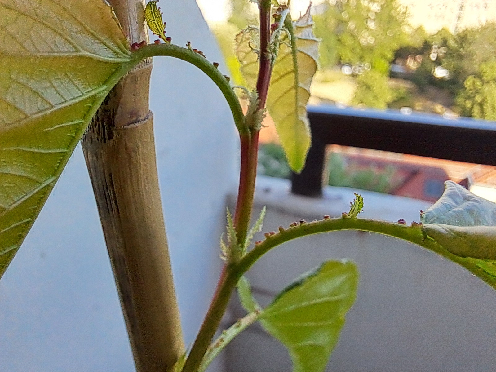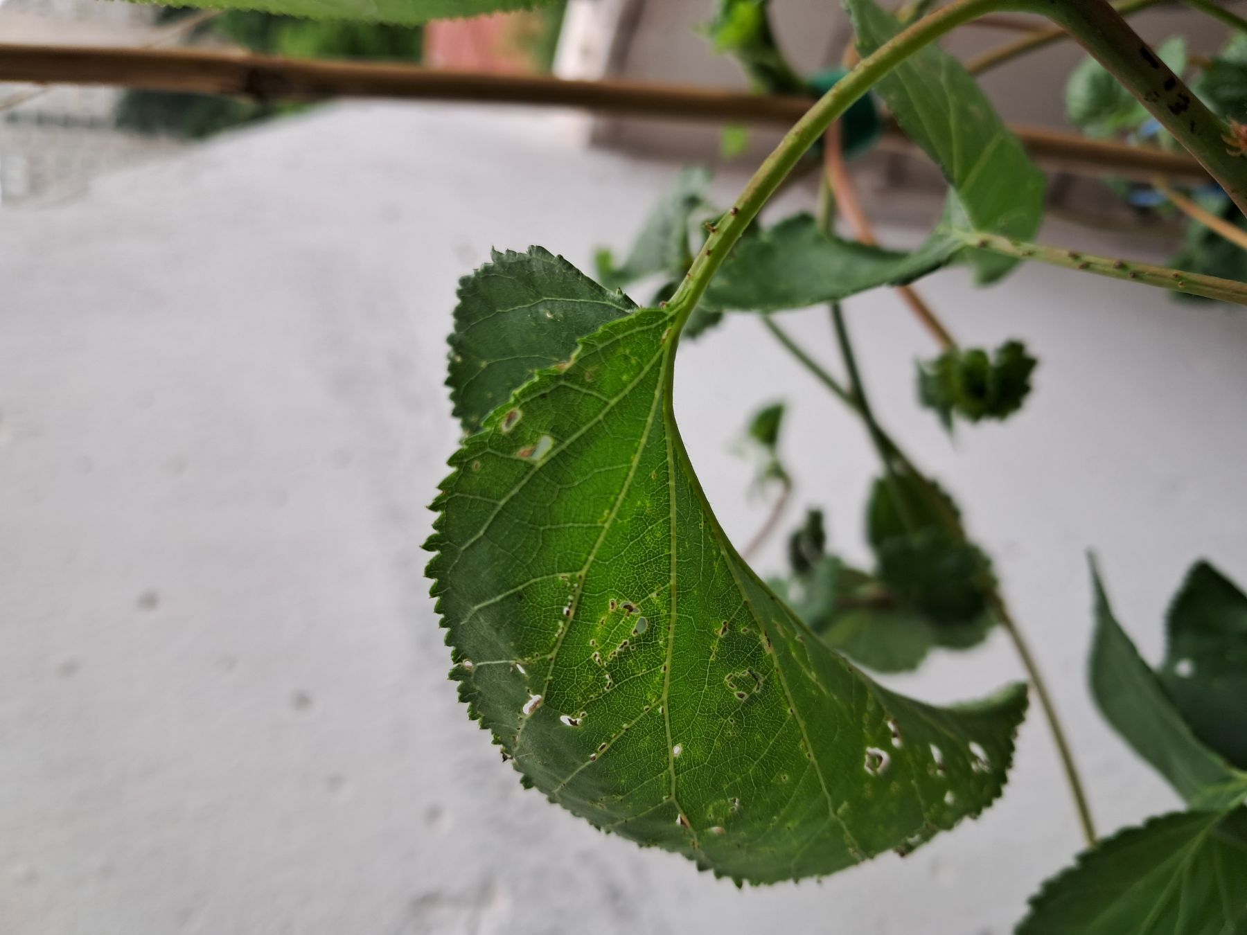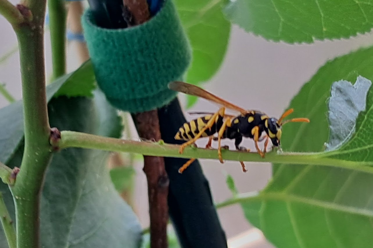 Erkélyen, cserépben nevelt sárgabarack csemetémet megtámadta valami, elsősorban a friss hajtásokat. A levelek lyukacsosak, a levélszárakon apró, peteszerű valamik vannak, amiket egy csíkos darázs rendszeresen meglátogat. Más élőlényt nem látok közlekedni a növényen, csak a földjén szaladgálnak rendkívül apró hangyafélék.