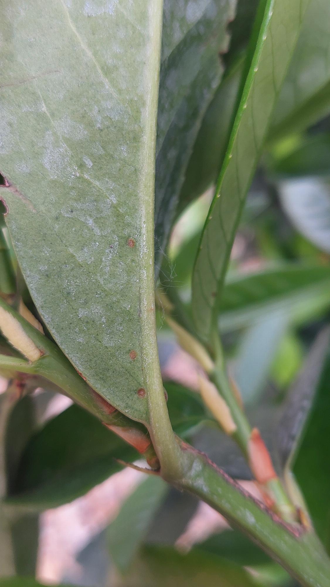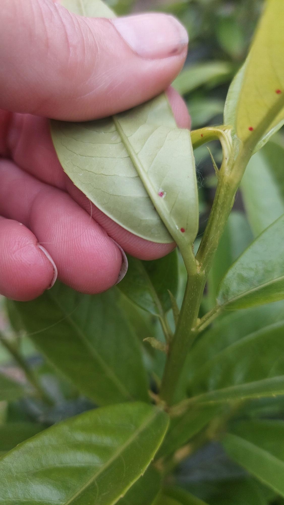 A segítségét szeretném a képen látható babérmeggy levél fonákján lévő apró piros pici cseppecskék miatt. Tűvel egyet megkarcoltam és elsötétedett , mögötte a levélen egy lyuk lett. Az előző évi leveleken látszik a nyoma, hogy hol lehettek. Mit lenne a javaslata.