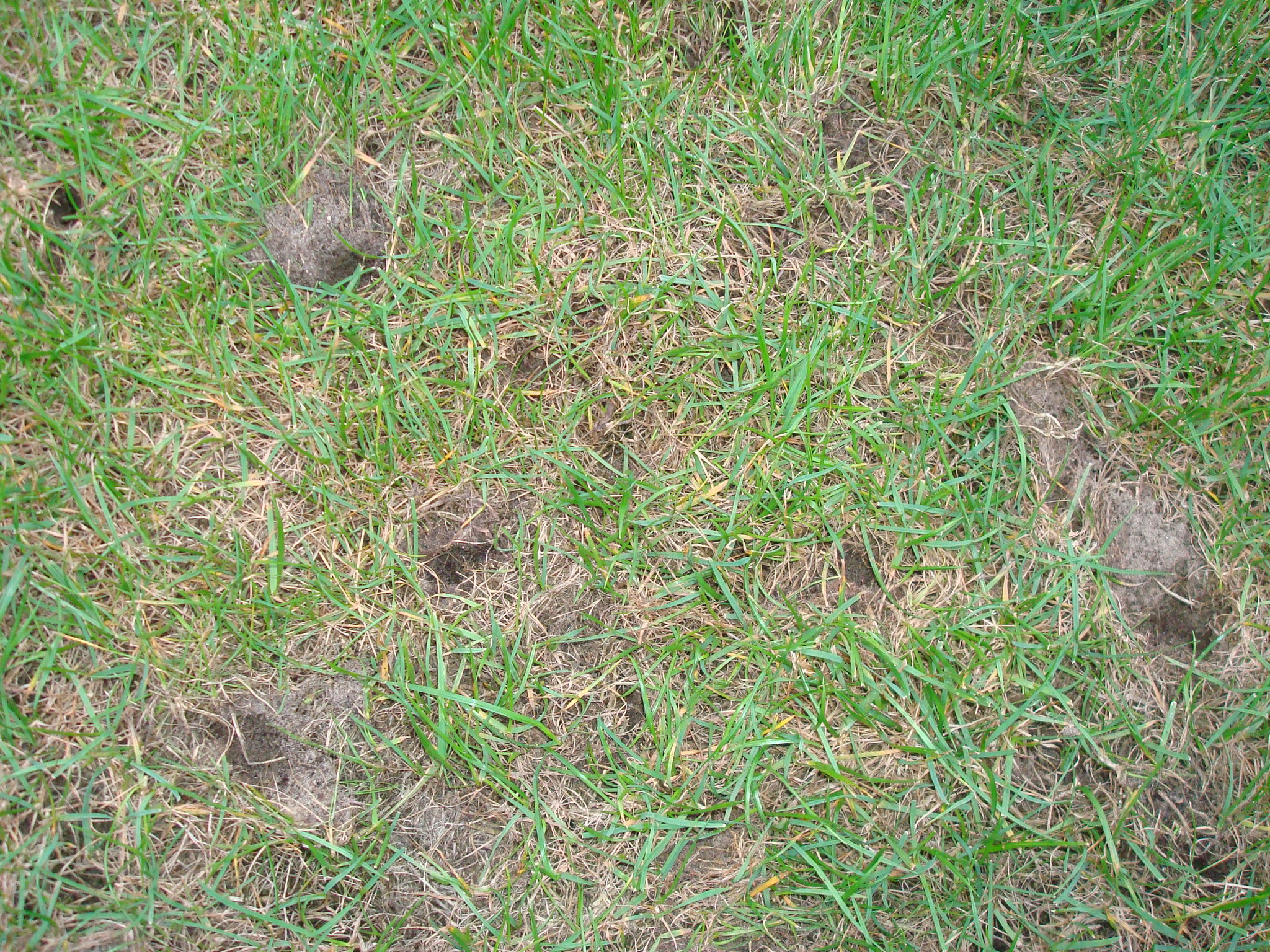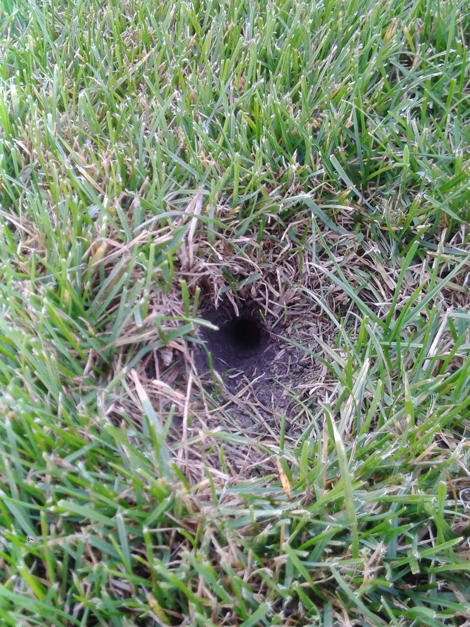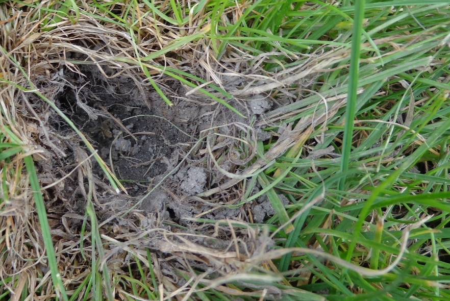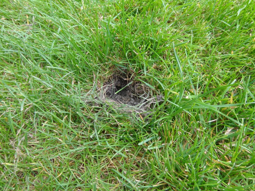 Milyen állat okozhatja a képen látható nyomokat. Lefelé nincs járat, a fű körbe meg van tekerve, közepérő több fűszál ki van tépve, az átmérő változó, de van 2-3 cm is. Legalább 40-50 db ilyen lyuk van, kb. 1 hónapja nő a számuk.