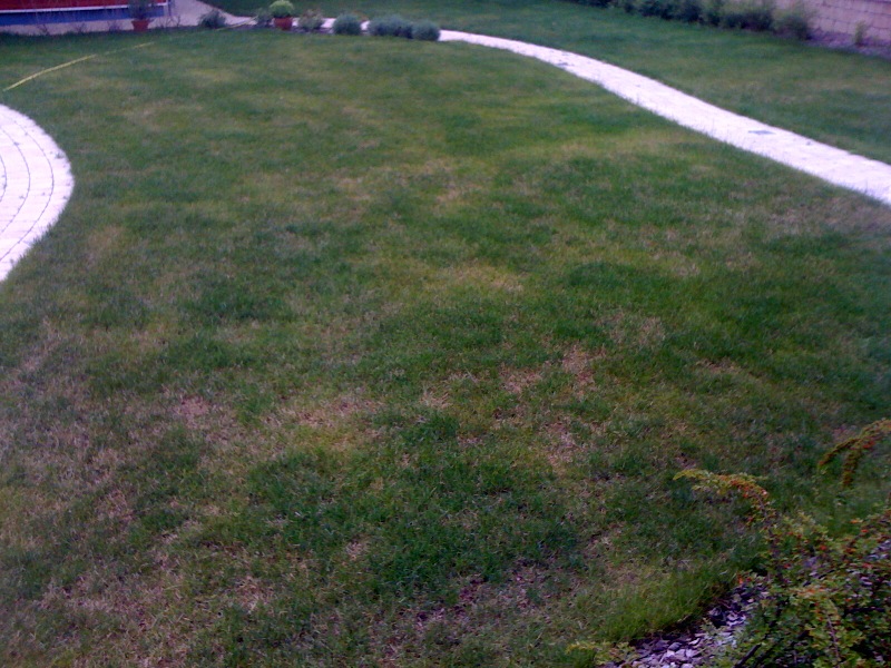A tavaly ősszel telepített gyepem iszonyatos sebességgel kezdett el száradni. Kb. egy hét alatt lett olyan ami a képeken látszik. Megvolt a szellőztetés, és a kezdő műtrágya kb. egy hónapja.