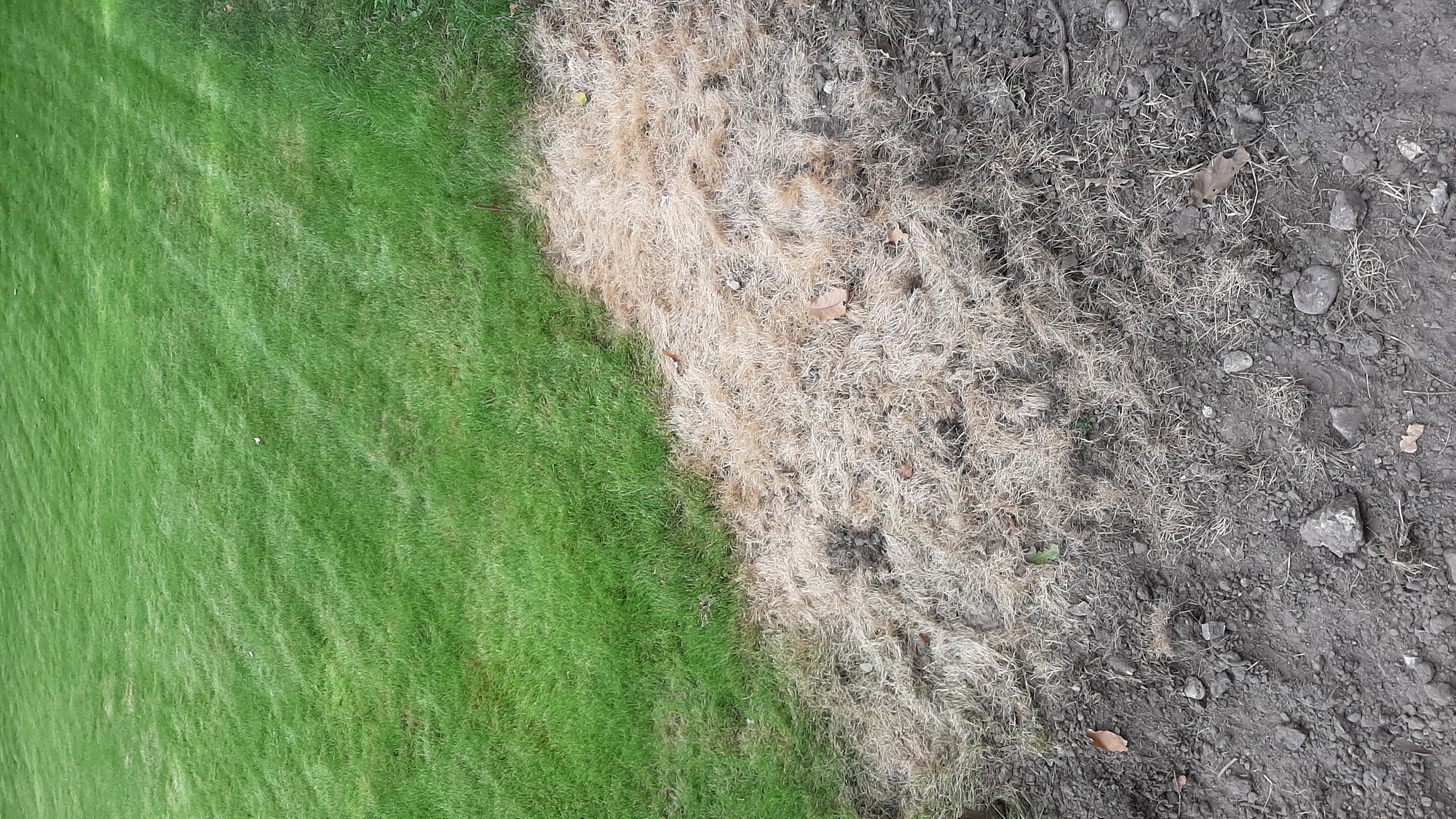 A (szárazságtűrő) gyep májusi vetésű, ami nagyon szépen fejlődött. A meleg beálltával egyre több gombás folt jelent meg,melyek egy az egyben ki is égtek, sőt még reggelente tucat számra lehet összeszedegetni a kalapos gombákat. Kb 2 hete jelent meg a füvön a képen is látható, elég nagy kiterjedésű folt, ami azóta is stagnál. Vártam vele, hátha magától elmúlik, de 2 hét leforgása alatt egyelőre nincs változás. A talaj szerkezete felső 15cm homokos-földes, alatta fekete földes, kissé agyagos.
