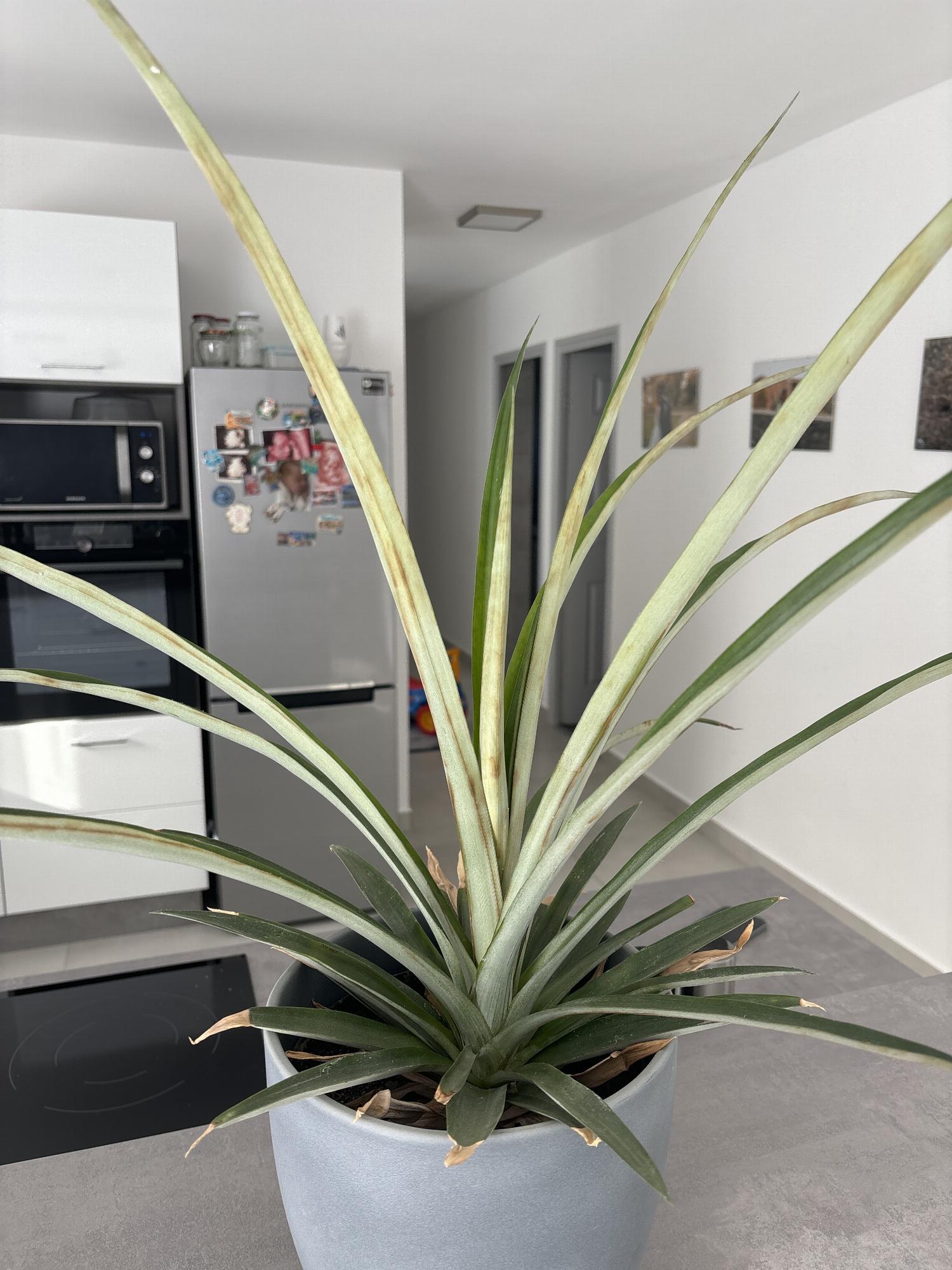 Kedves szakértők! Egy ananász termésről gyökereztettem és hajtattam ananász. Már 1.5 éves kb. Eddig nagyon szépen nőtt, bent van, ablakban, úgy tűnt jó helyen van. Volt mellette másik növény is amin kialakult valami fehér pókhálószerű valamit. Ezt most megláttam az ananászomon is. Mit tehetek, hogy ne menjen tönkre? A másik növényt kidobtam. Illetve kicsit mintha barnulna is.