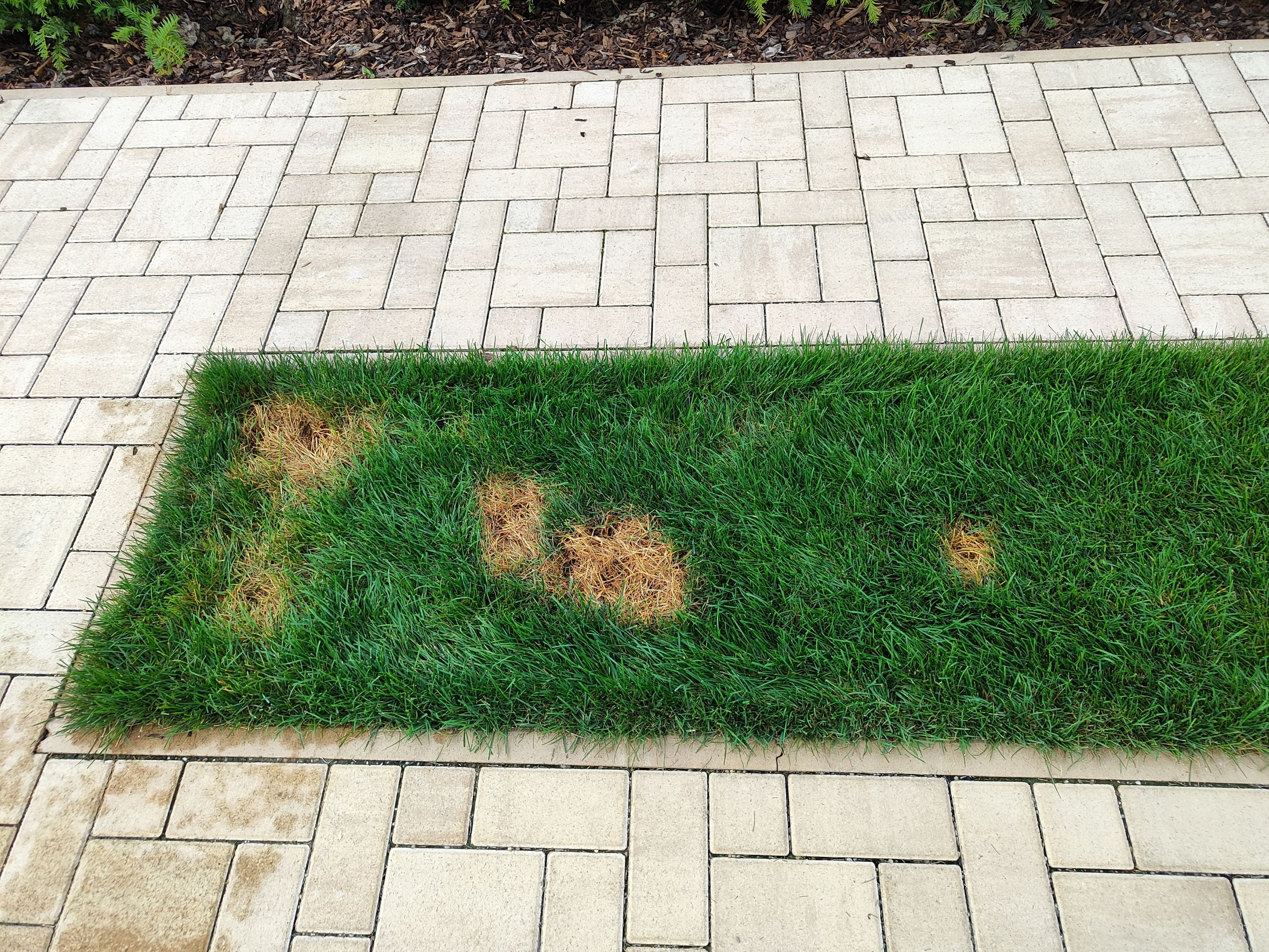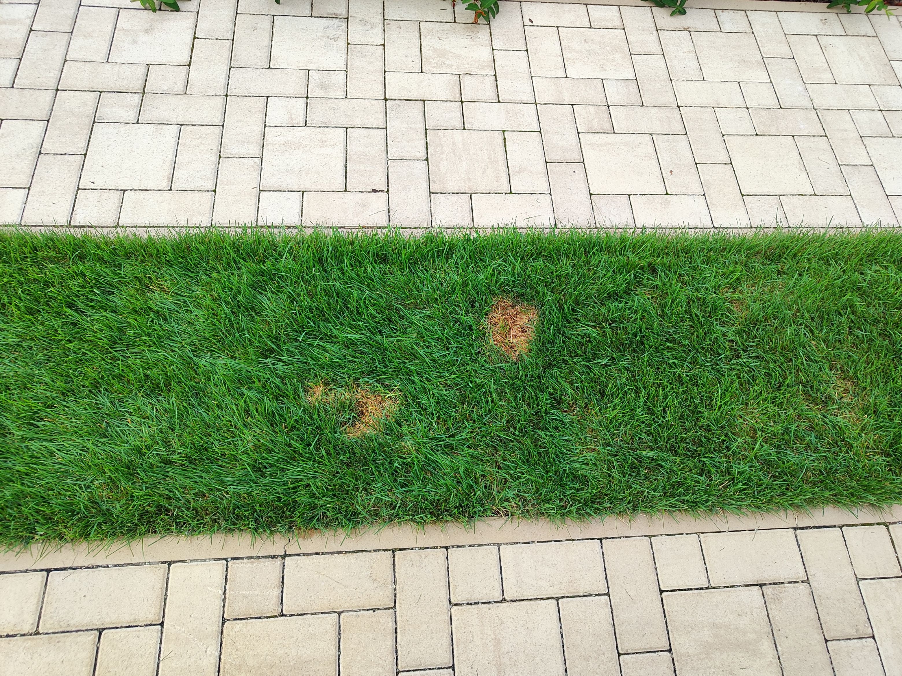 Az ún. "dollárfolt-betegségnek" tűnik, amit egy kórokozó gomba okoz. Kezdetben a foltok kicsik, 2-3 cm átmérőjűek. Általában meleg, párás időszakban, jelenik meg, főleg ha a fűnek túl sok nitrogént ad, illetve túlságosan gyakran, de kis adagban öntözi, nam hagyja a gyepfelszínt kiszáradni. Őszi-téli felkészítő műtrágyát javaslunk a gyors regenerálódáshoz.